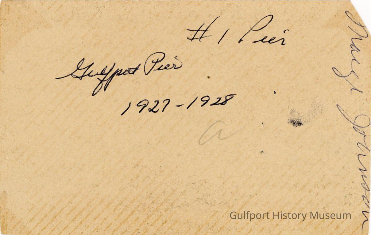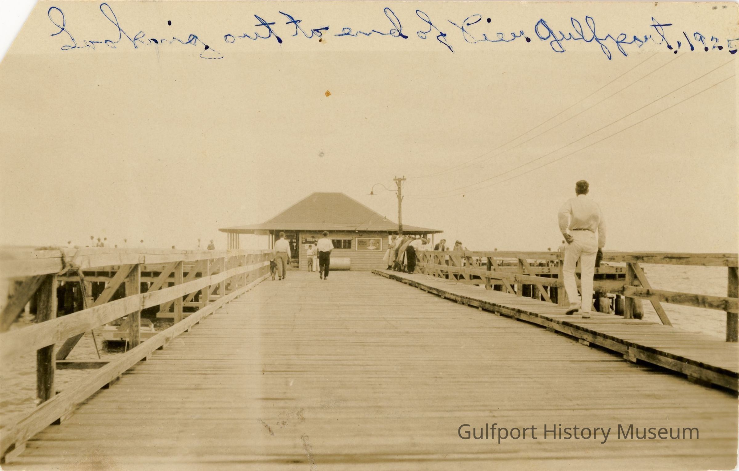 A black and white photograph of several men walking down the Gulfport Pier. Handwriting at the top of the photograph reads "Looking out to end of pier. Gulfport, 1925."