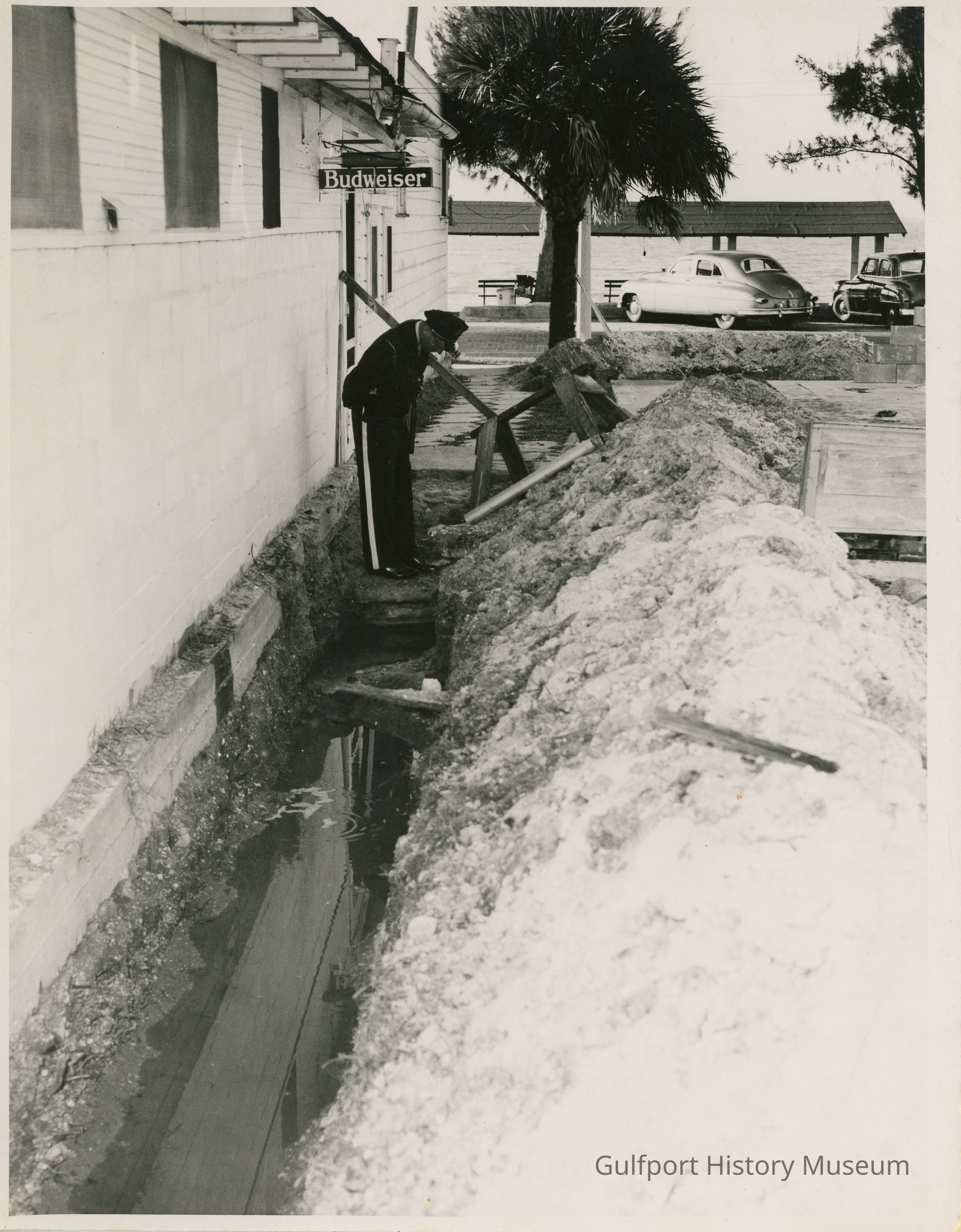 A black and white photograph of an officer standing in a trench next to an establishment on Shore Blvd. The building has a sign which reads "Budweiser" hanging above the officer and beside the door. Parked cars and Boca Ciega Bay are visible in the background.