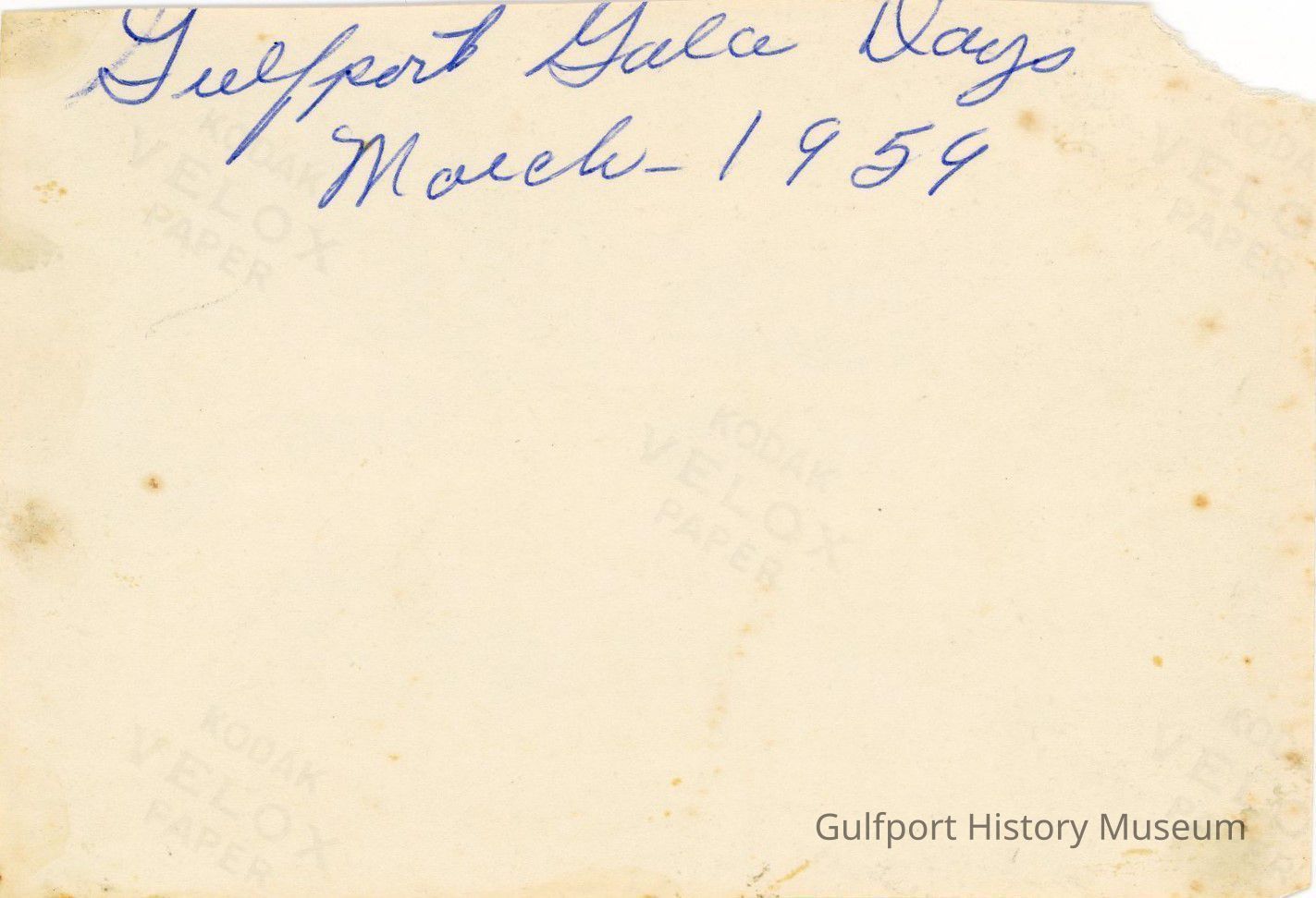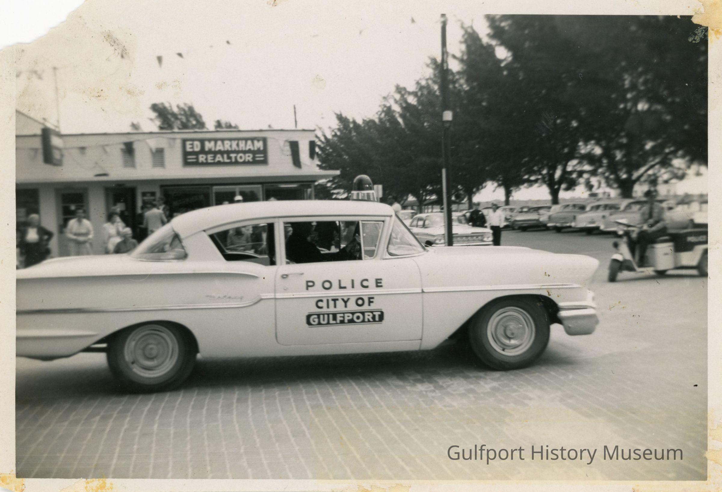 A black and white photograph of a Gulfport Police Department vehicle driving near the intersection of Beach Blvd and Shore Blvd during the Gala Days Parade. Another office can be seen on a large motor scooter. People line the sidewalk. Ed Markham's real estate office is visible behind the car.
