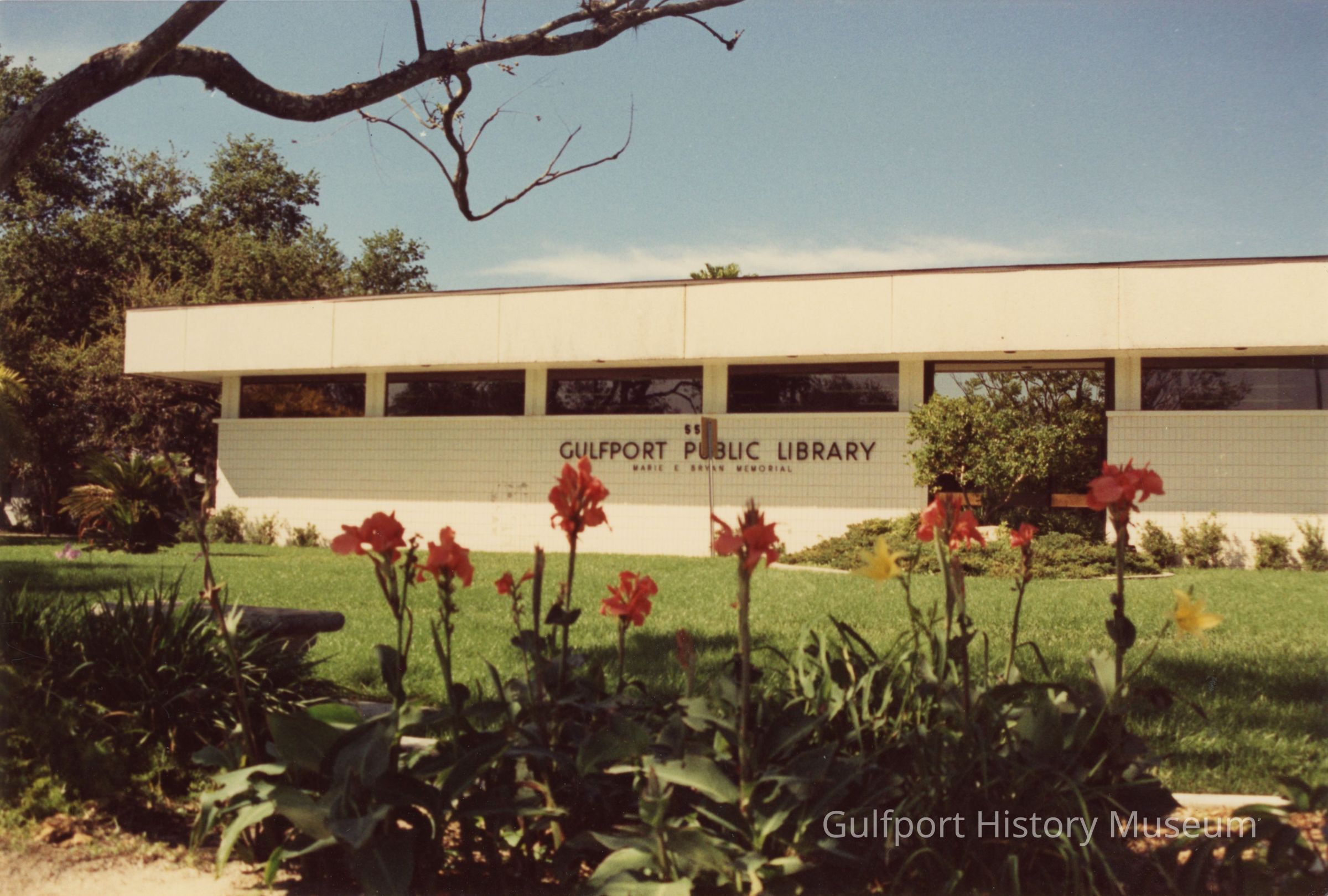 A color photograph of the Gulfport Public Library from 28th Ave S. It is a one story, white building with long windows and reads "GULFPORT PUBLIC LIBRARY MARIE E. BRYAN MEMORIAL." Various landscaping is visible in the foreground.