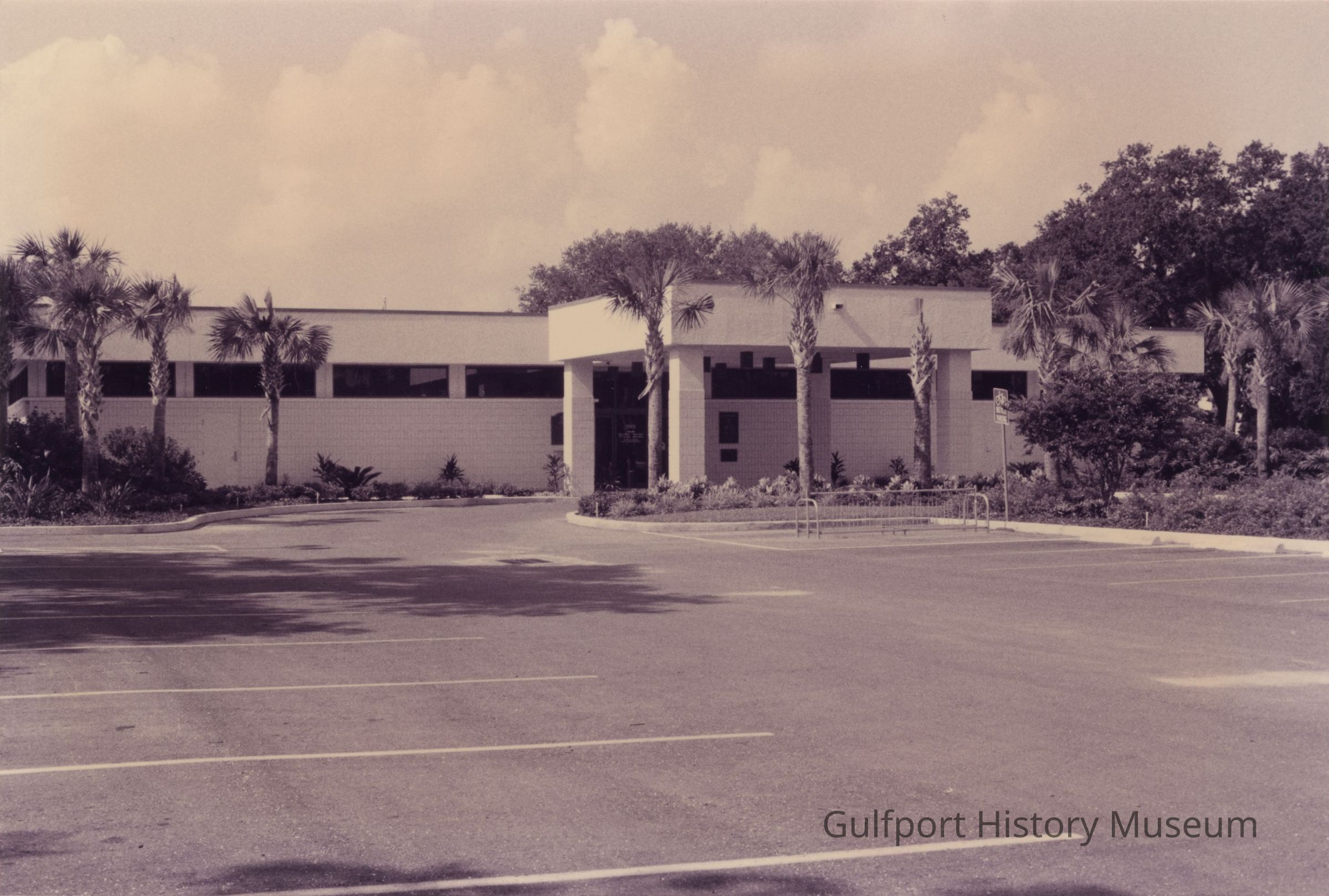 A black and white photograph of the Gulfport Public Library from the parking lot on 27th Ave S. It is a one story, white building with long windows and a covered entrance driveway.