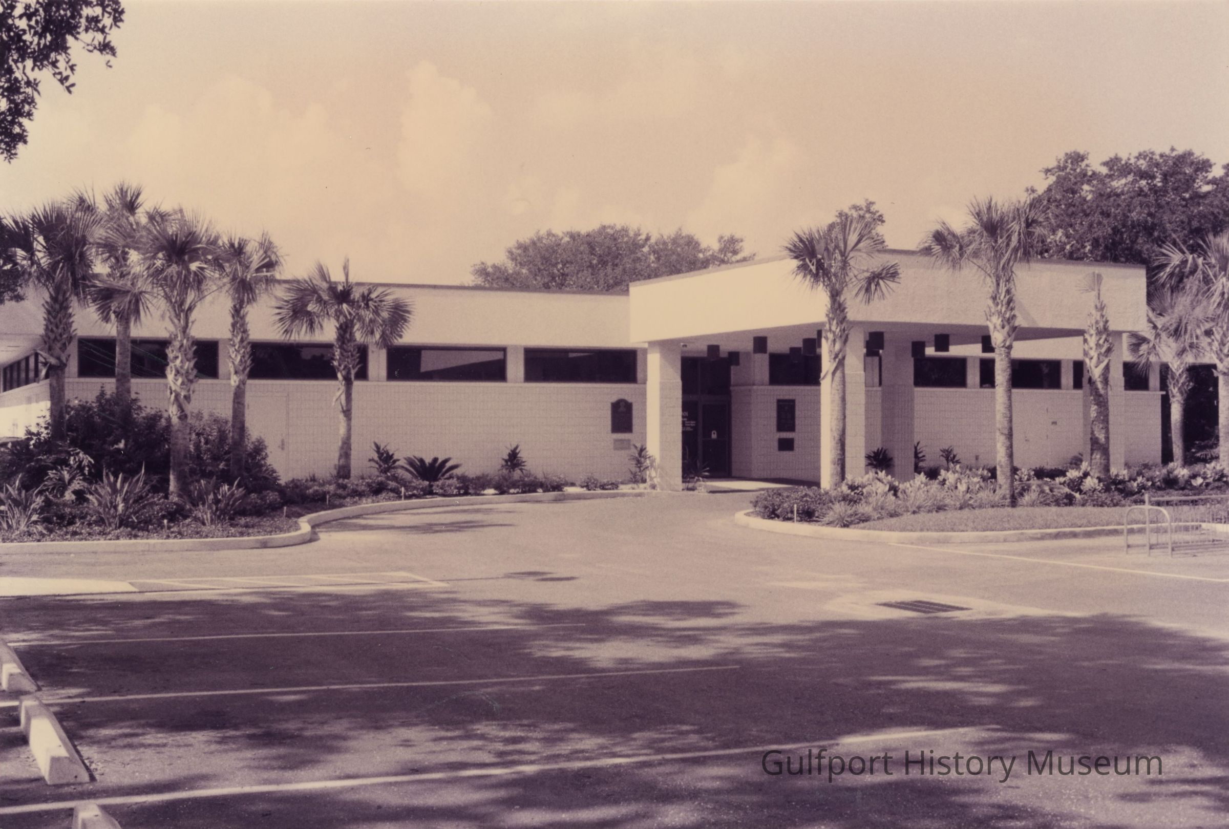 A black and white photograph of the Gulfport Public Library from the parking lot on 27th Ave S. It is a one story, white building with long windows and a covered entrance driveway.