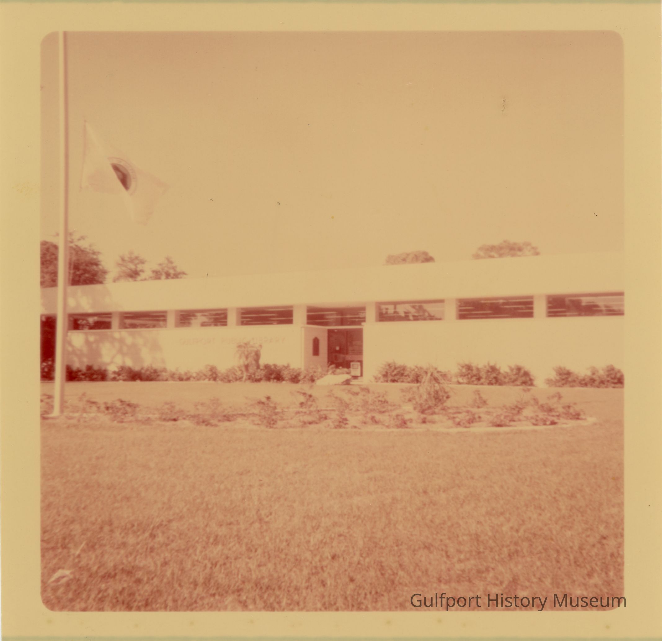 A color photograph of the exterior of the Gulfport Public Library from 28th Ave S. The front of the library features a landscaped lawn and a flag pole.