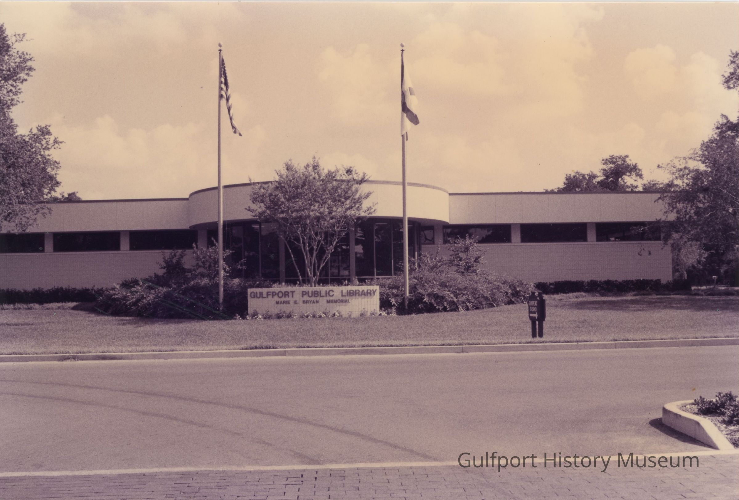 A black and white photograph of the Gulfport Public Library following a 1994 addition to the building. The new exterior features a rounded atrium. A sign in front of the building reads "GULFPORT PUBLIC LIBRARY MARIE E. BRYAN MEMORIAL" and is flanked by various landscaping. The American flag and the flag of Florida are raised. A small sign by the road which reads, "GULFPORT CASINO" points down Beach Blvd in the direction of the camera.