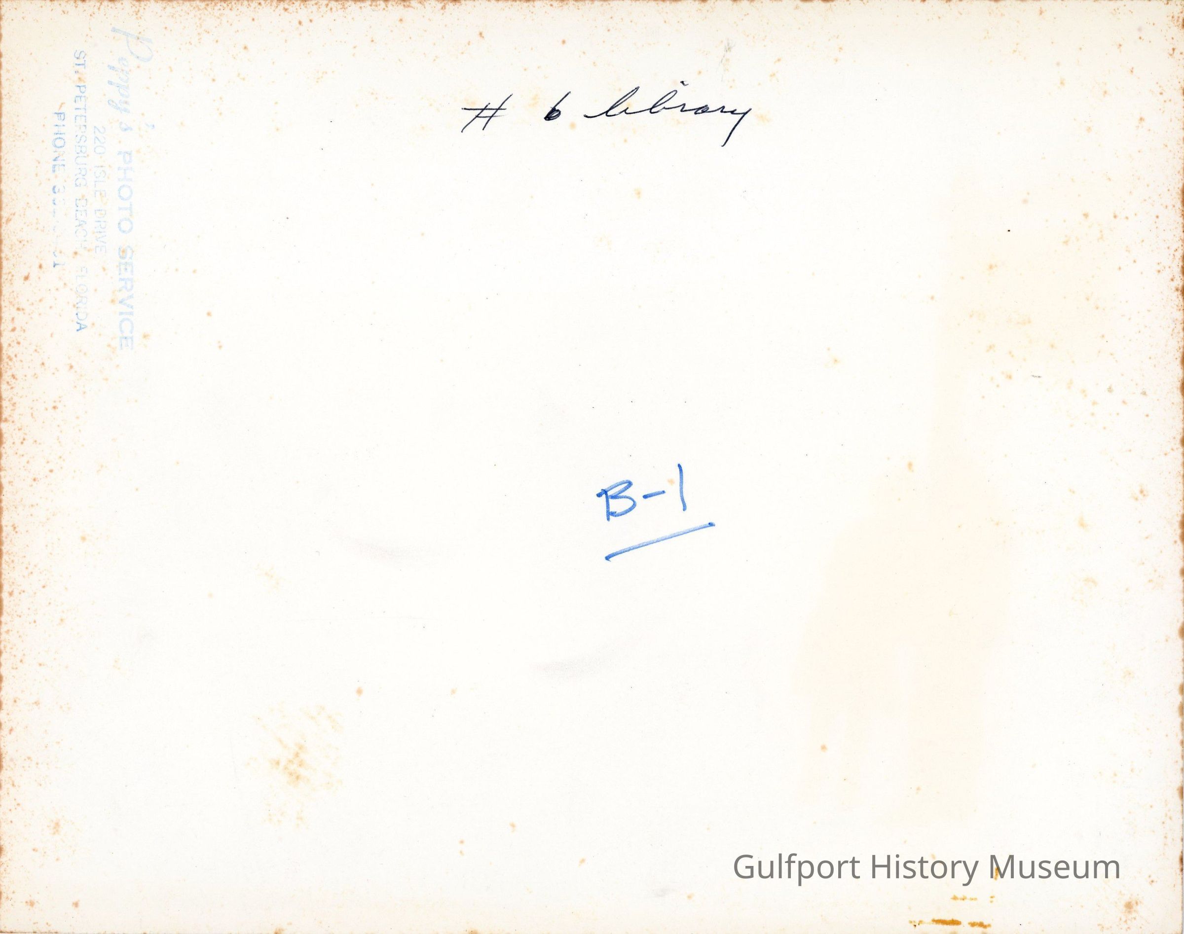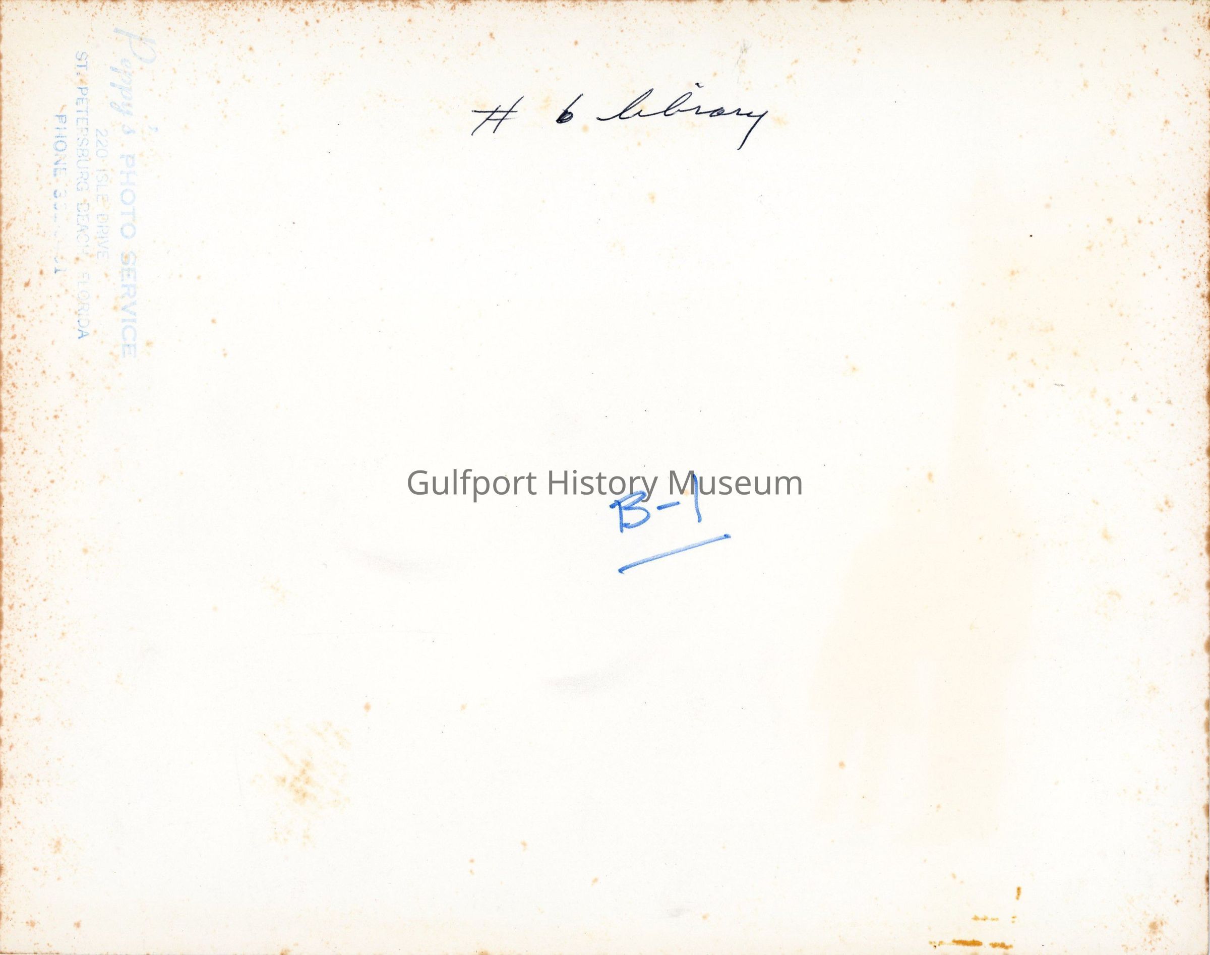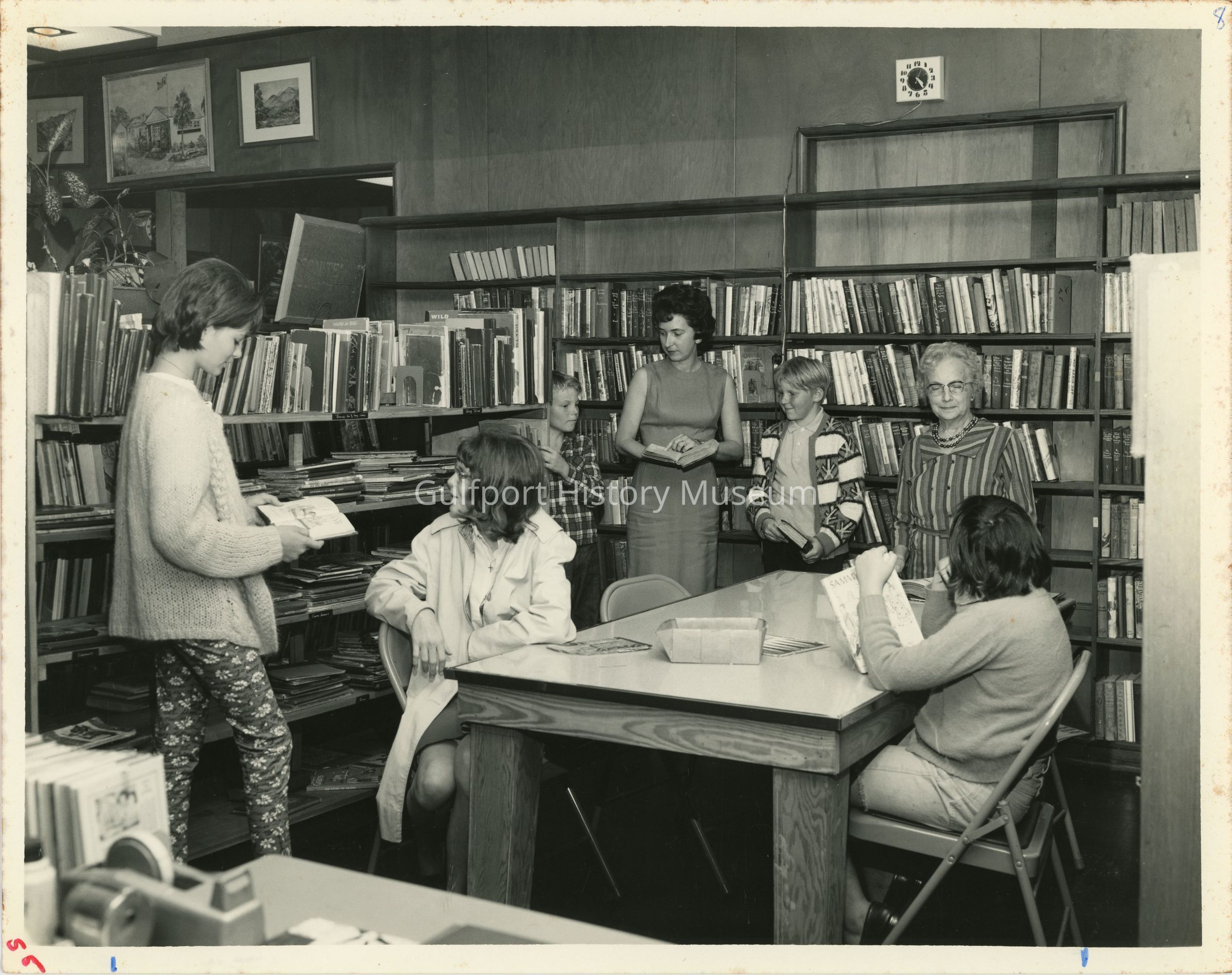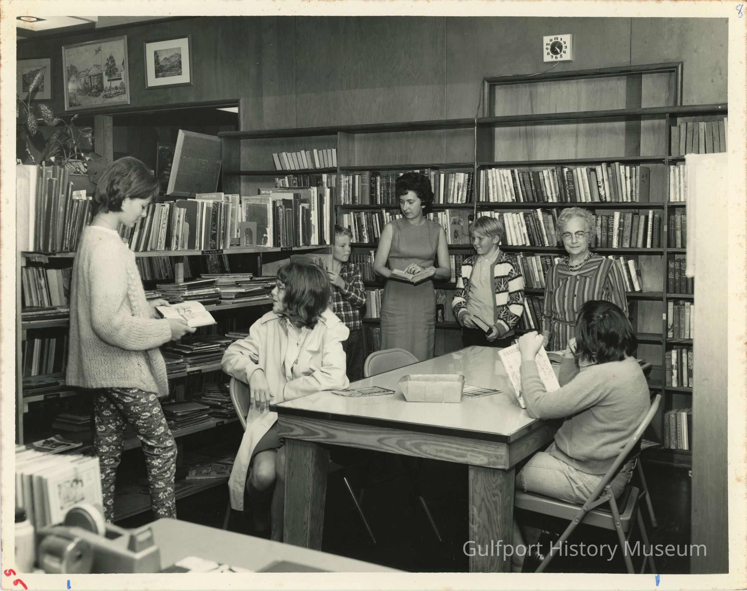 A black and white photograph of several people in a library. Two women are sitting at a table, one of which is having a conversation with a younger girl on the left, and the other is turned to face an older woman behind her. Behind them is a woman with an open book in her hands and two young boys to her left and right. They are surrounded by bookshelves.