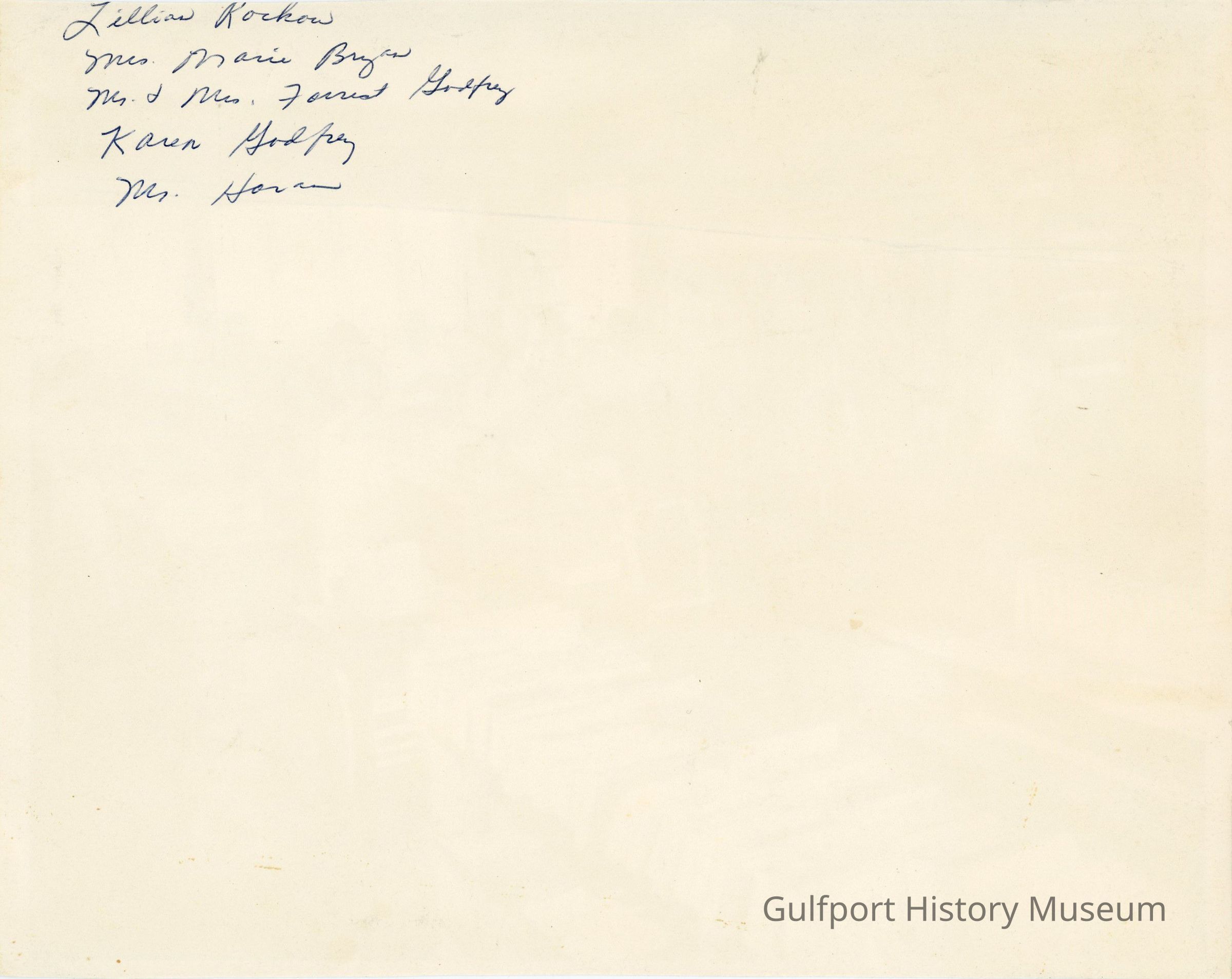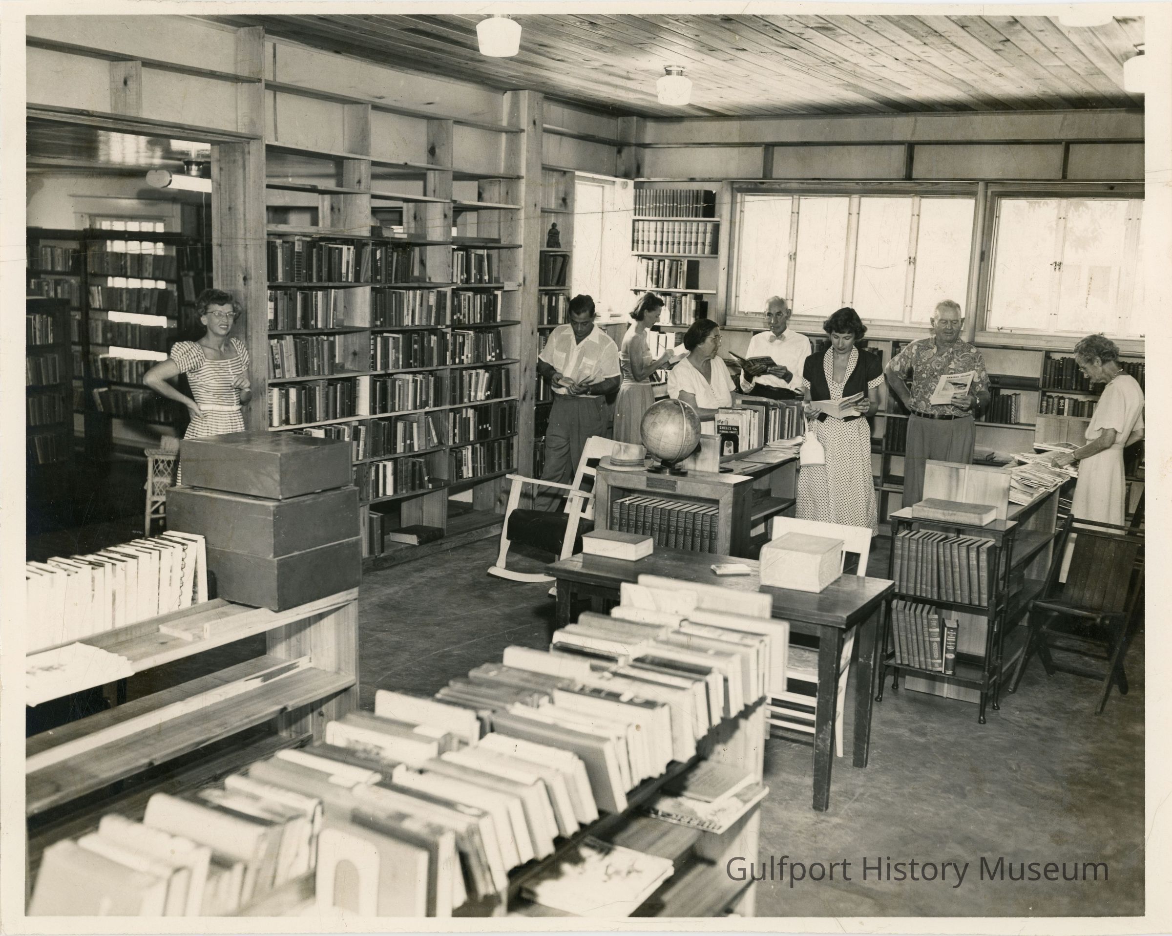 A black and white photograph of several people inside a library. Seven people on the right of the photograph look through aisles and read from books. [Harold Fox stands near the stacks looking at a book.] [A librarian] stands in a doorway on the left and looks at the camera. A rocking chair and globe can be seen at the center of photograph.