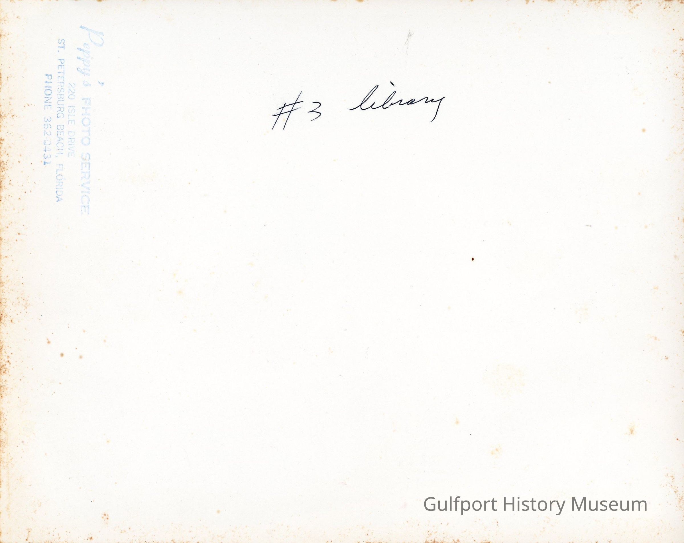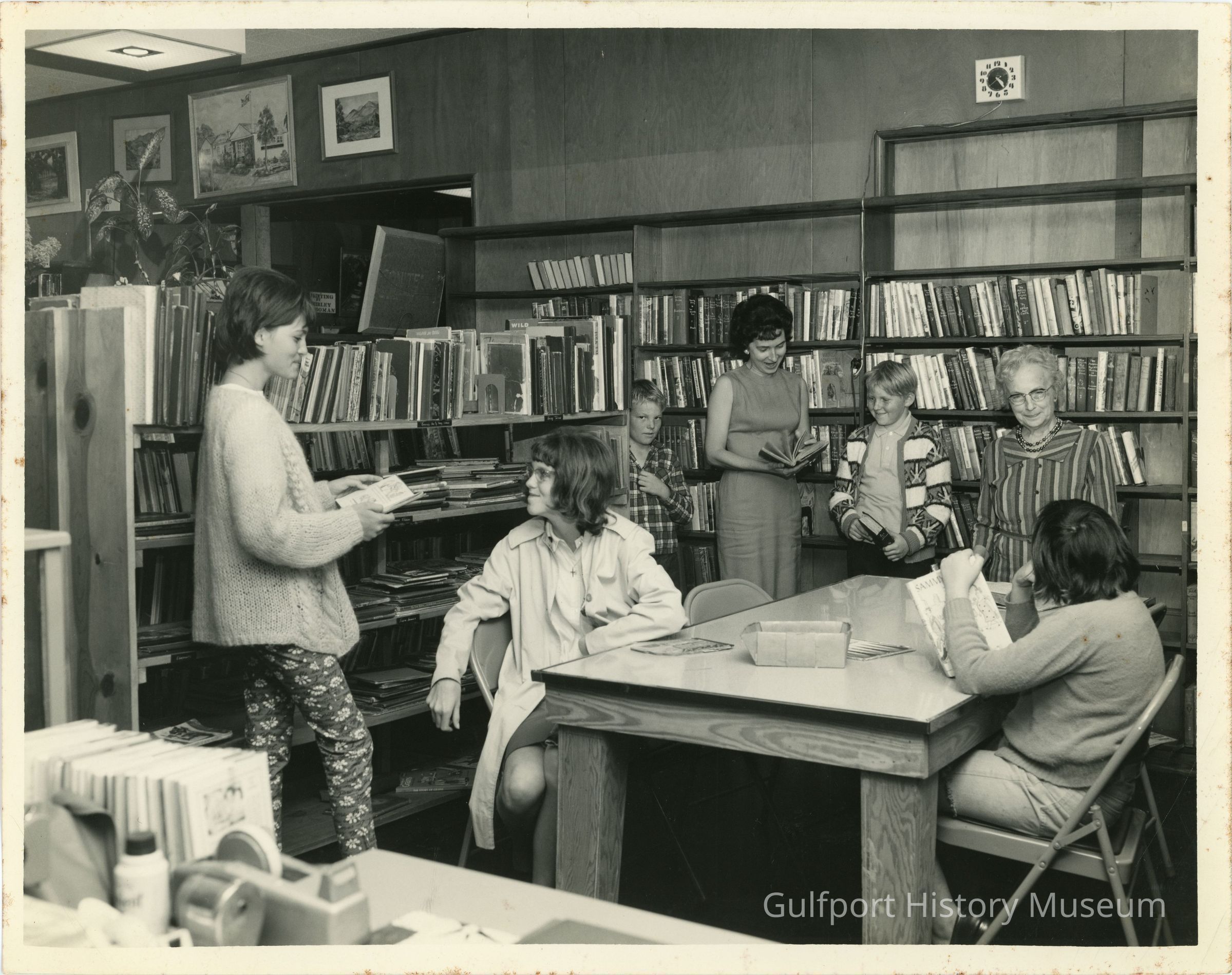 A black and white photograph of several people in a library. Almost everyone in the photo is smiling. Two women are sitting at a table, one of which is having a conversation with a younger girl on the left, and the other is turned to face an older woman behind her. Behind them is a woman with an open book in her hands and two young boys to her left and right. They are surrounded by bookshelves.