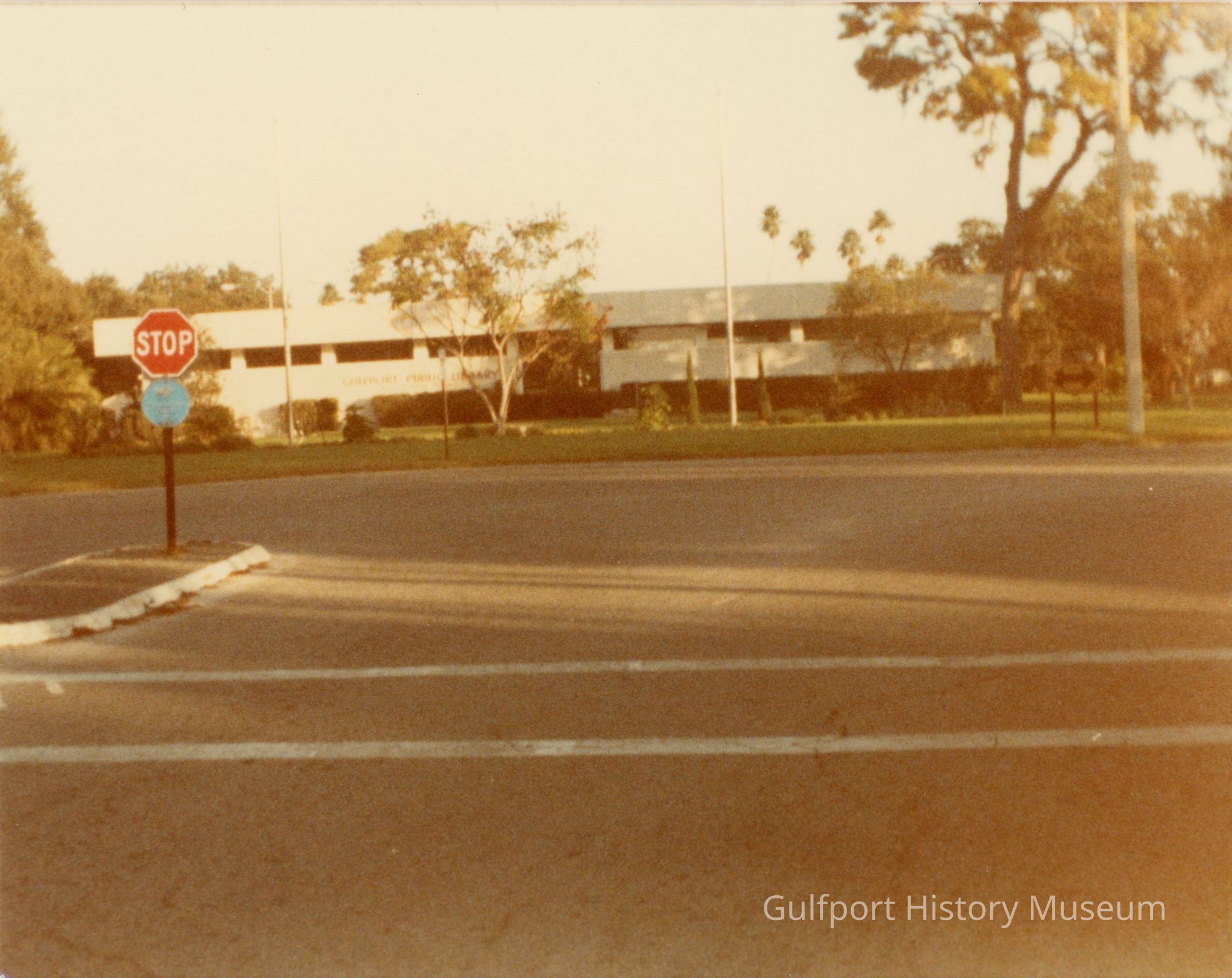 A color photograph of the front of the Gulfport Public Library from Beach Blvd S at 28th Ave S. The width of the building is fully visible. The lawn in front of the building is landscaped. A stop sign stands at the intersection in the foreground.