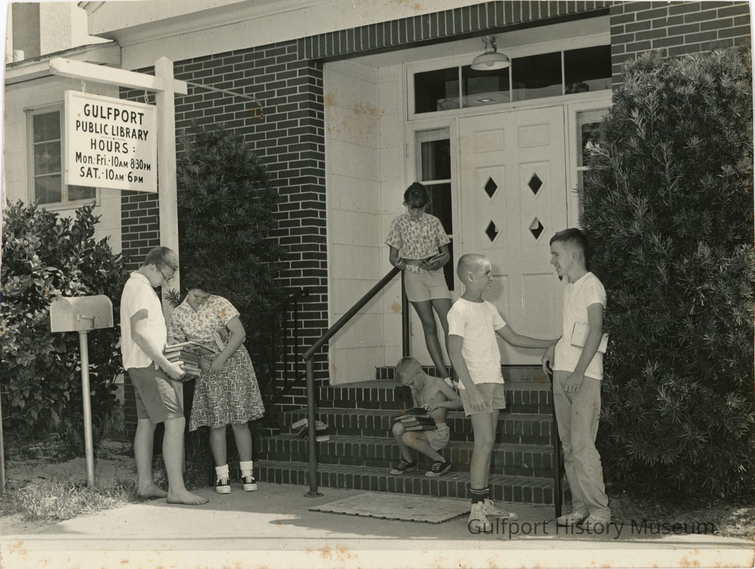 A black and white photograph of six children outside of the former Gulfport Public Library. On the left, a boy and Joan Dopico look at books; they are standing under a sign reading: "GULFPORT PUBLIC LIBRARY HOURS: Mon.-Fri.-10AM-8:30PM SAT.-10AM-6PM." In the middle of the photograph, a young boy sits on the steps to the main entrance while looking through his stack of books. Melissa Marie Welch stands at the top of the stairs reading from a book. On the right, Derek Mengerick talks to another boy who has a book under his arm.