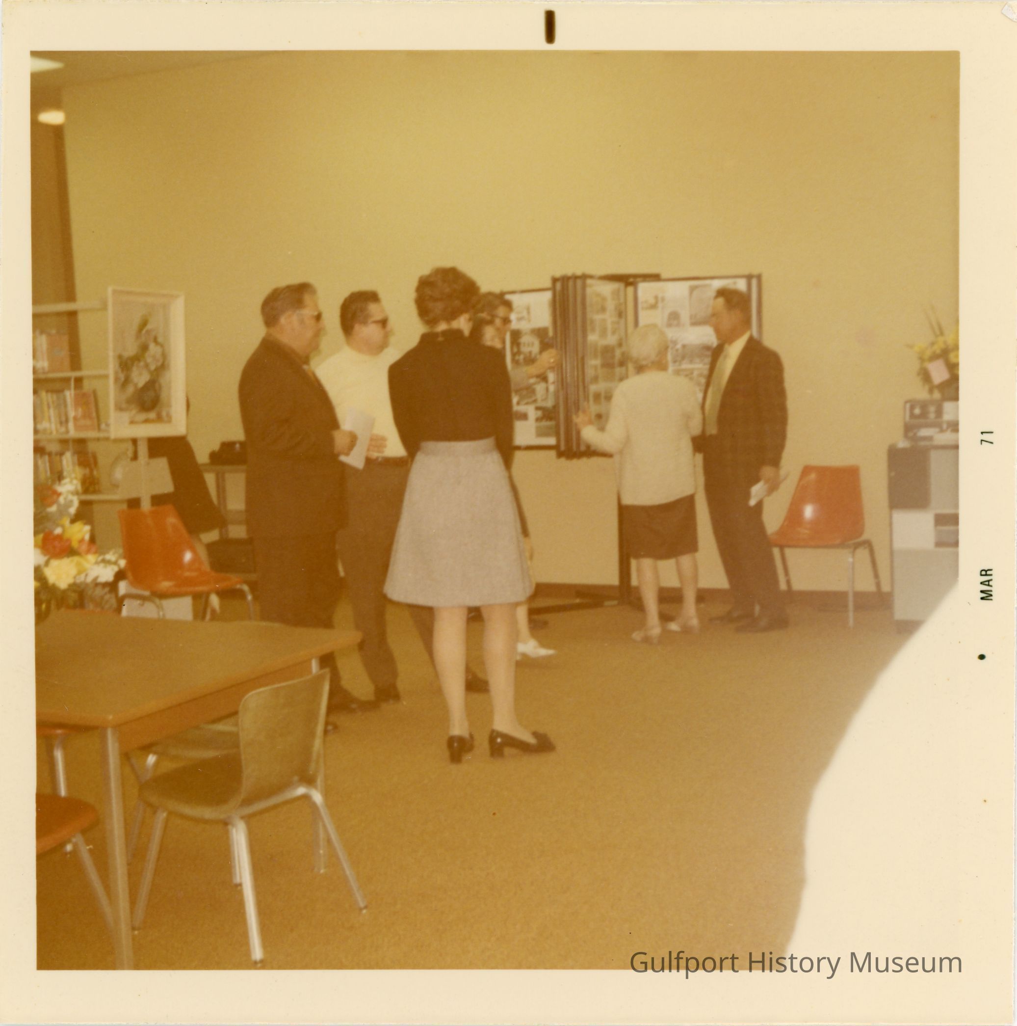 A color photograph of several people in the Gulfport Public Library. They are standing around an installation that allows viewers to flip through large pages of newspaper clippings and photographs. The woman who is closest to the camera is holding a baby. Something very close to the camera is obscuring the bottom right corner of the image, possibly someone's arm.