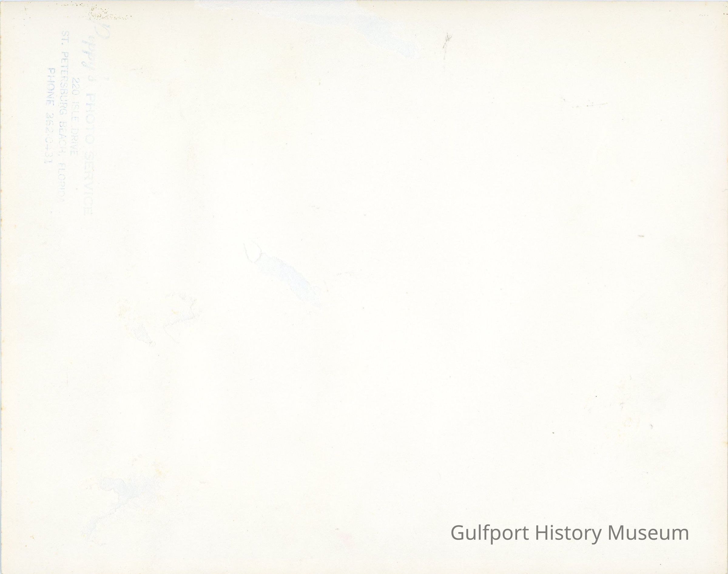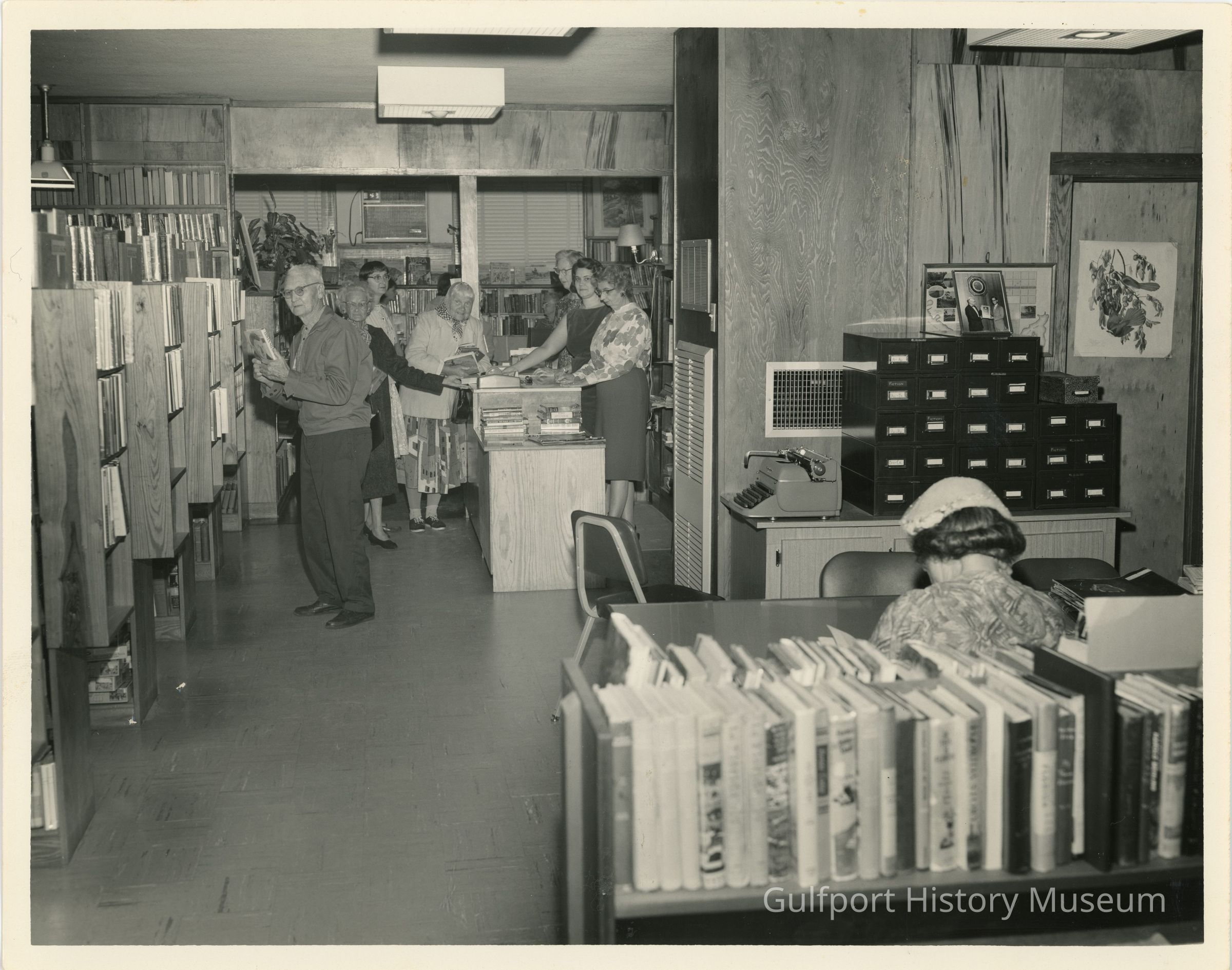 A black and white photograph of the inside of a library. In the foreground, a woman sitting at a table is facing away and looking down, presumably reading a book. There is a card catalog and typewriter on a table against the wall. In the background is a line of people checking out books at a desk. There are three women behind the desk. Almost everyone is looking at the camera.