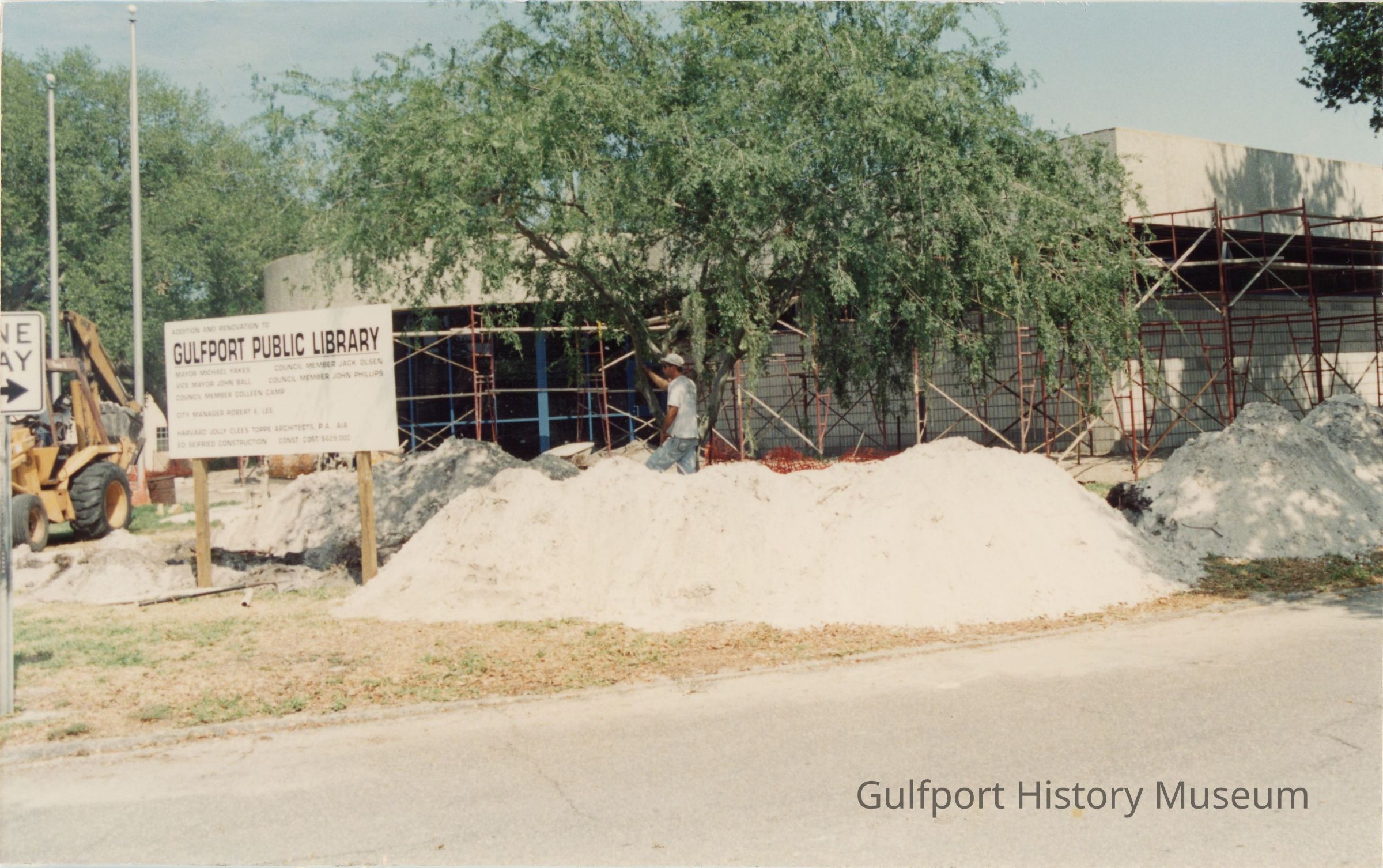 A color photograph showing the construction of an addition to the Gulfport Public Library. A worker walks between piles of debris toward a construction vehicle. A sign reads: