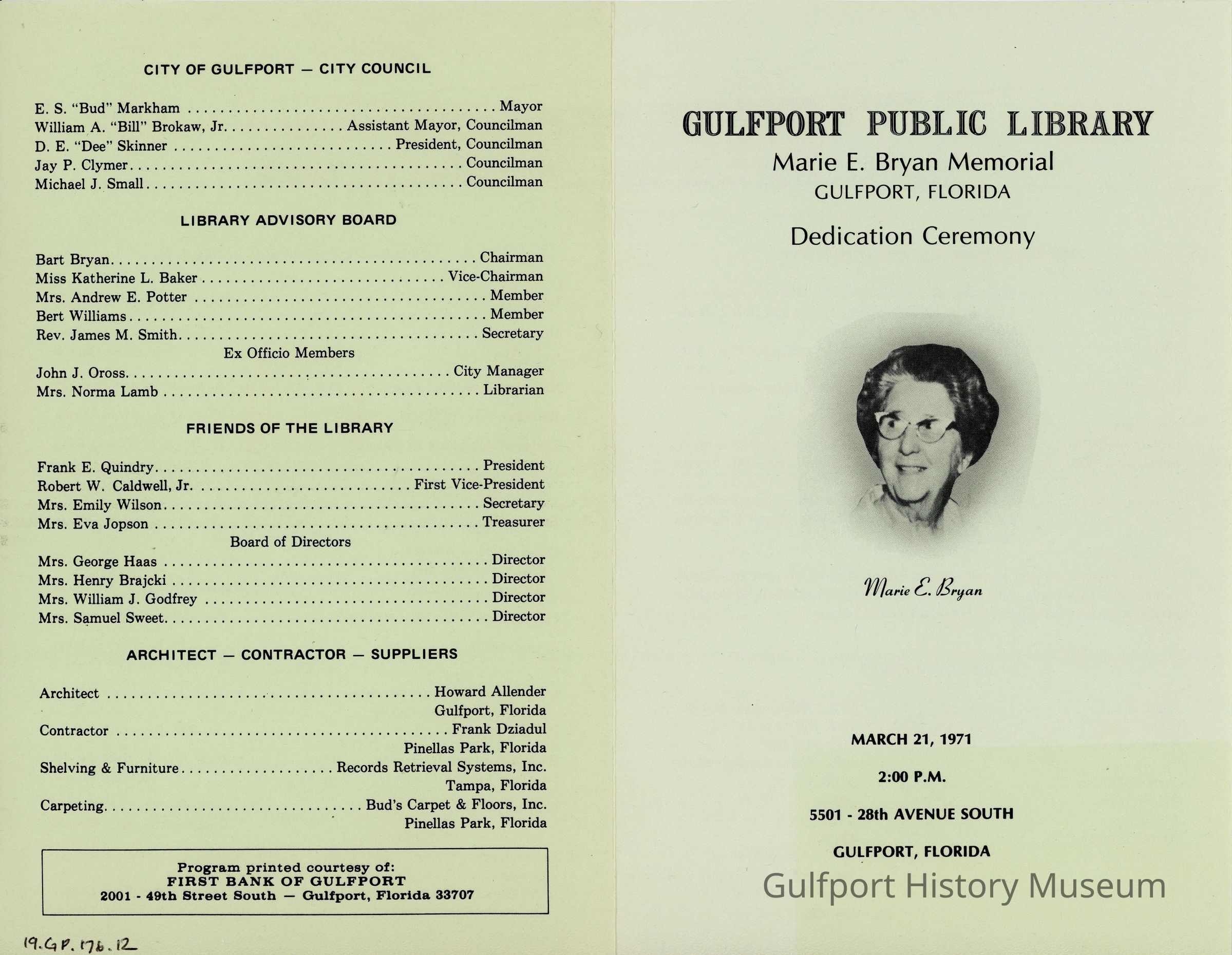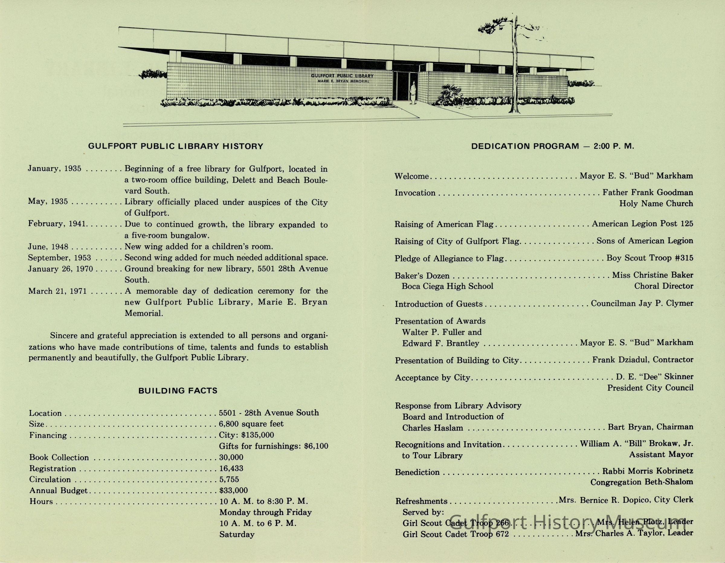 March 21, 1971.......A memorable day of dedication ceremony for the new Gulfport Public Library, Marie E. Bryan Memorial.Transcriber