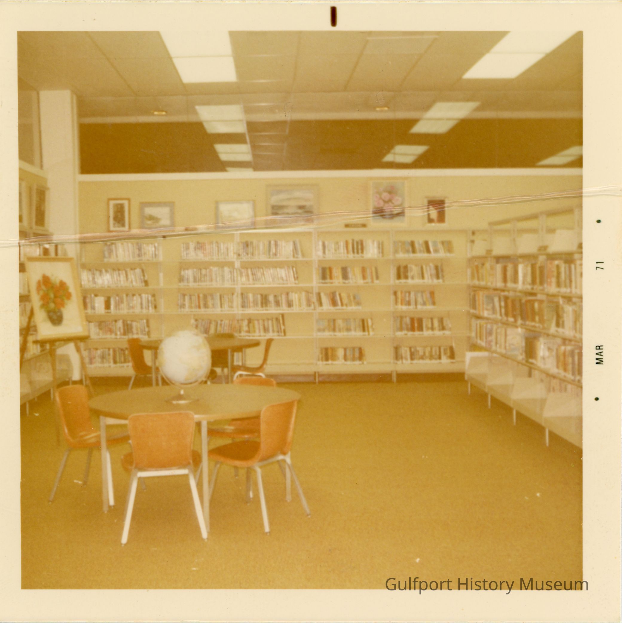 A color photograph of the interior of the Gulfport Public Library with two tables and a set of surrounding bookshelves. There are paintings on top of the bookshelf against the wall, and one on an easel beside the tables. There is a globe on one of the tables.