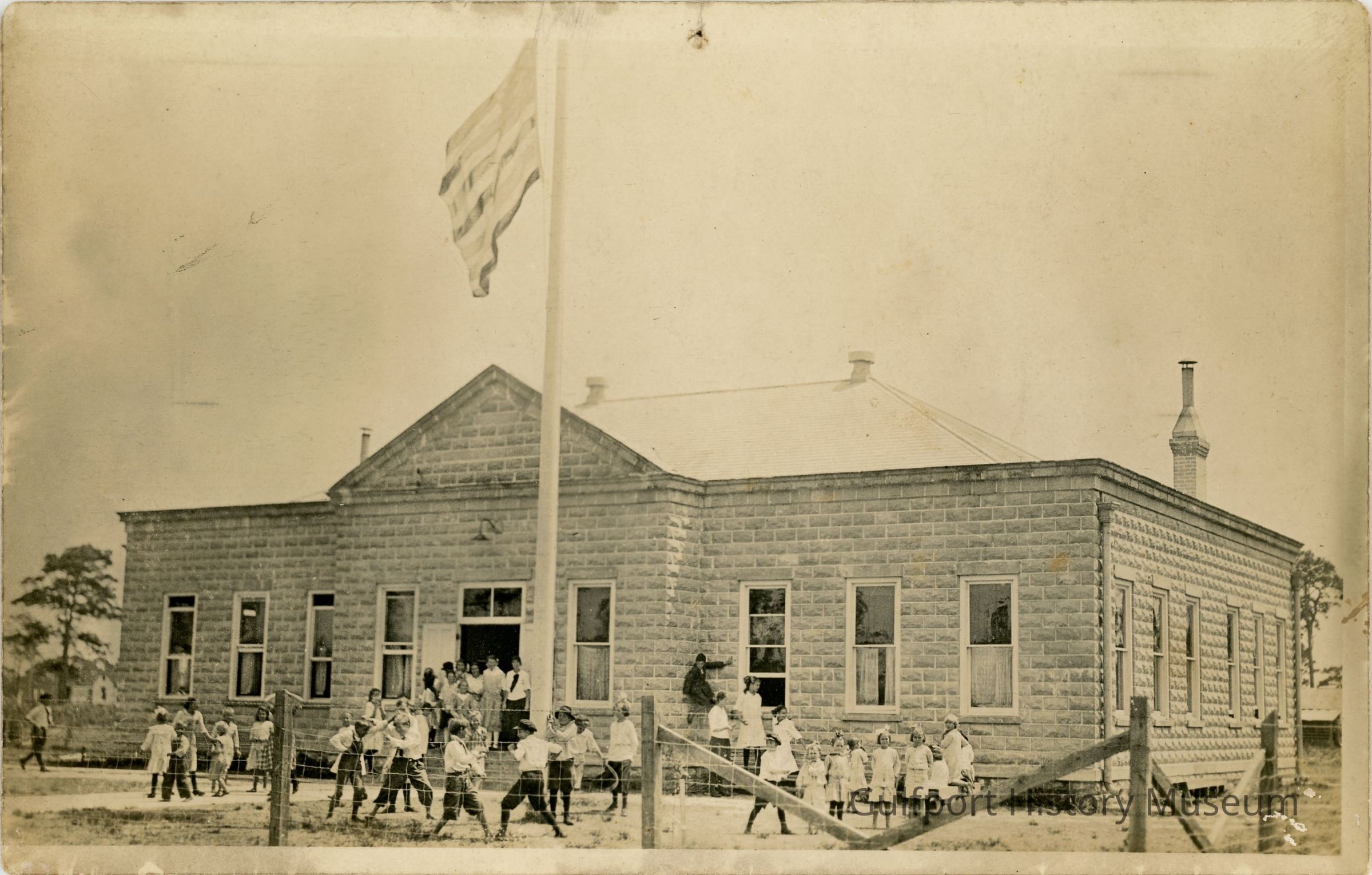 A black and white photograph postcard showing the original Gulfport Elementary School building. An American flag is raised and children are playing in the schoolyard in front of the building.Subject