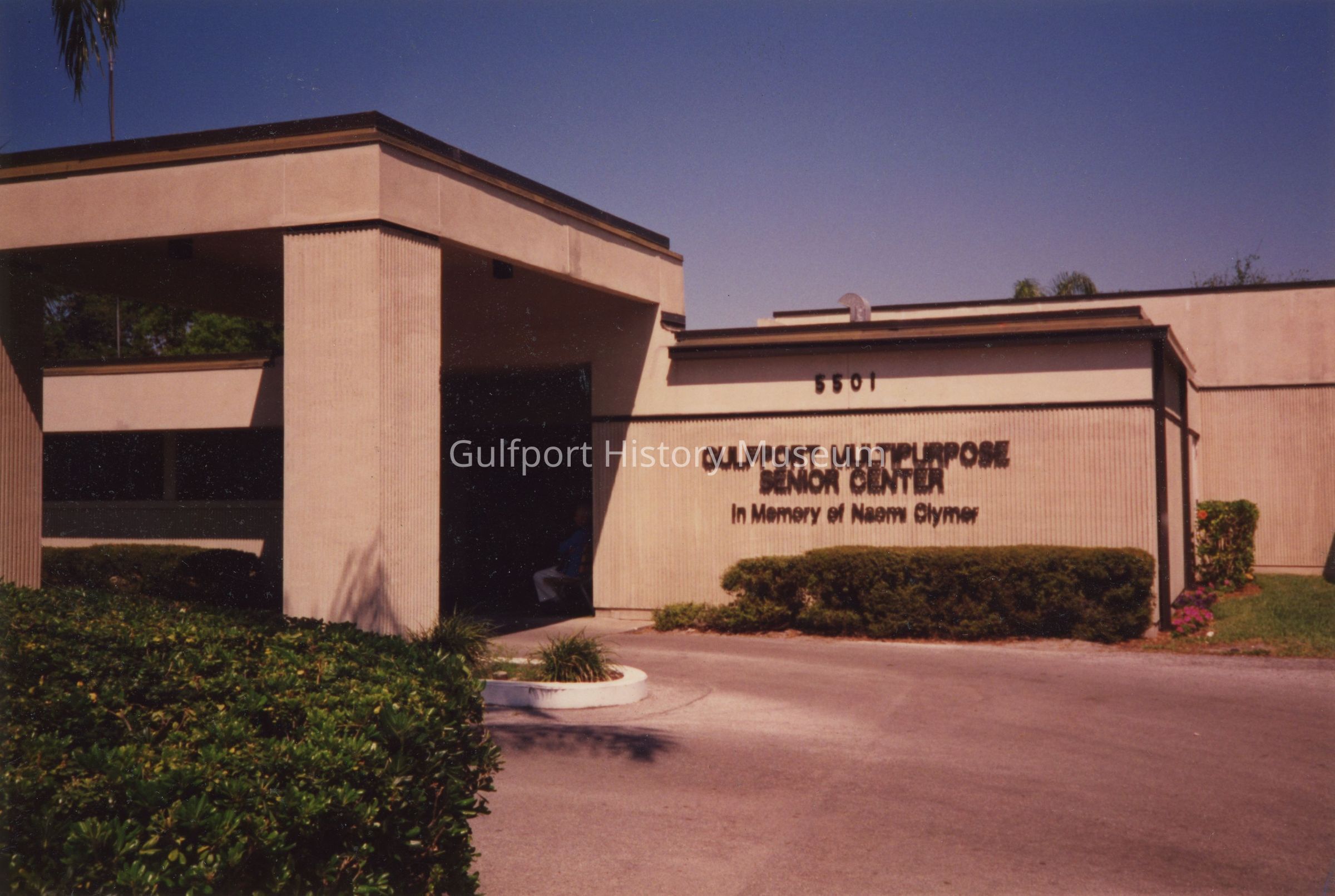 A color photograph of the front entrance of the Gulfport Multipurpose Senior Center. The letters on the building read "GULFPORT MULTIPURPOSE SENIOR CENTER In Memory of Naomi Clymer."