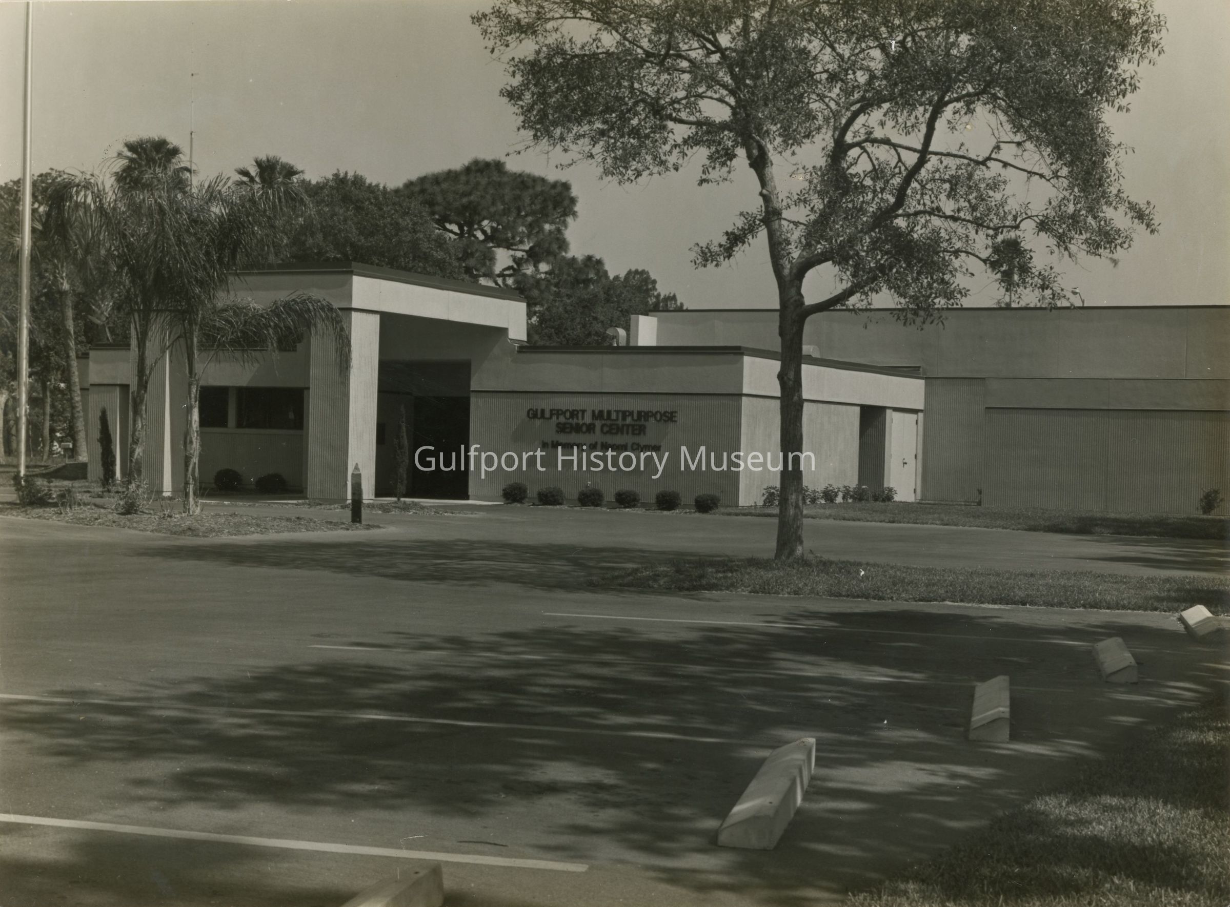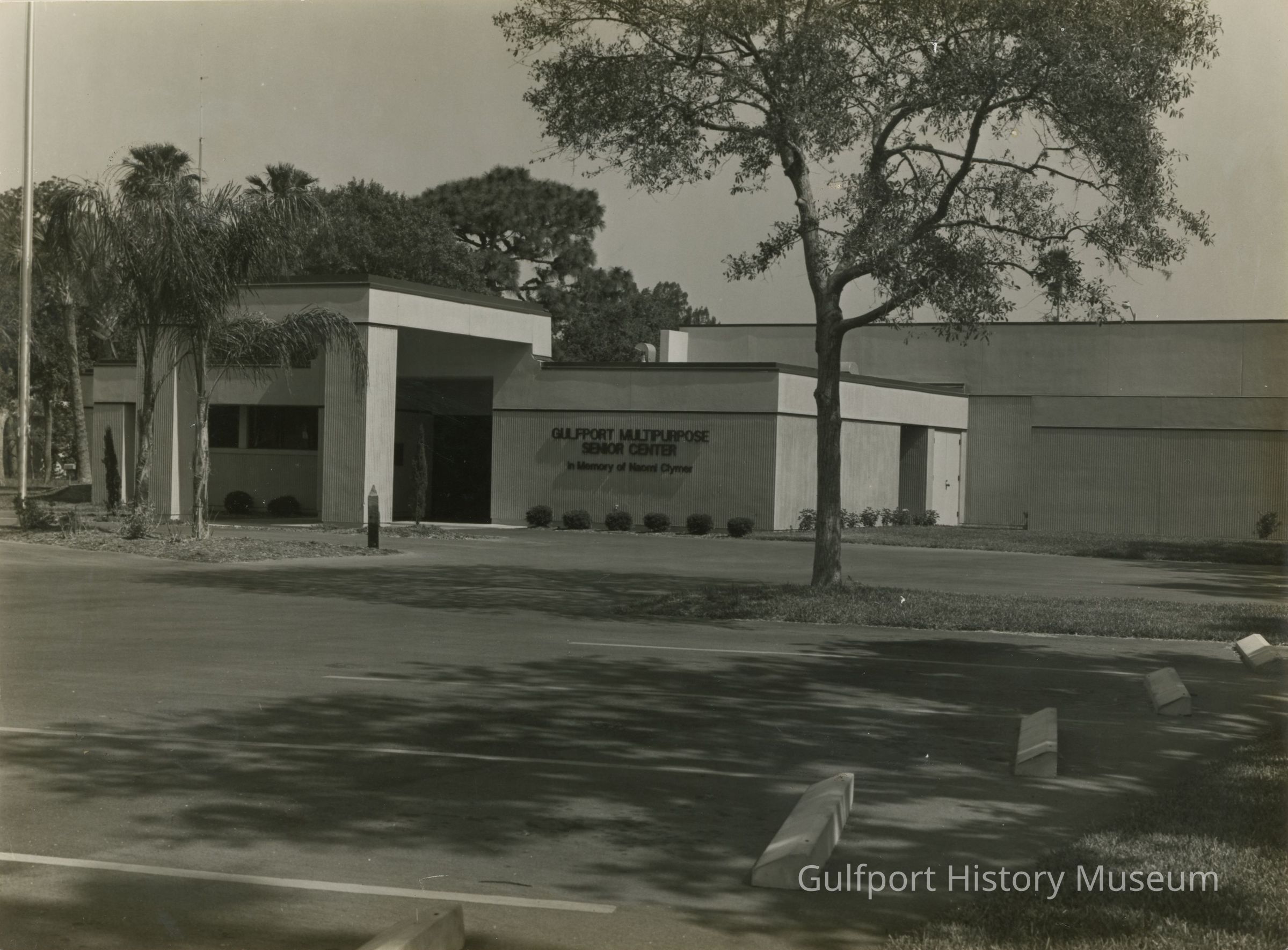 A black and white photograph of the Gulfport Multipurpose Senior Center. The building reads: "GULFPORT MULTIPURPOSE SENIOR CENTER / In Memory of Naomi Clymer."