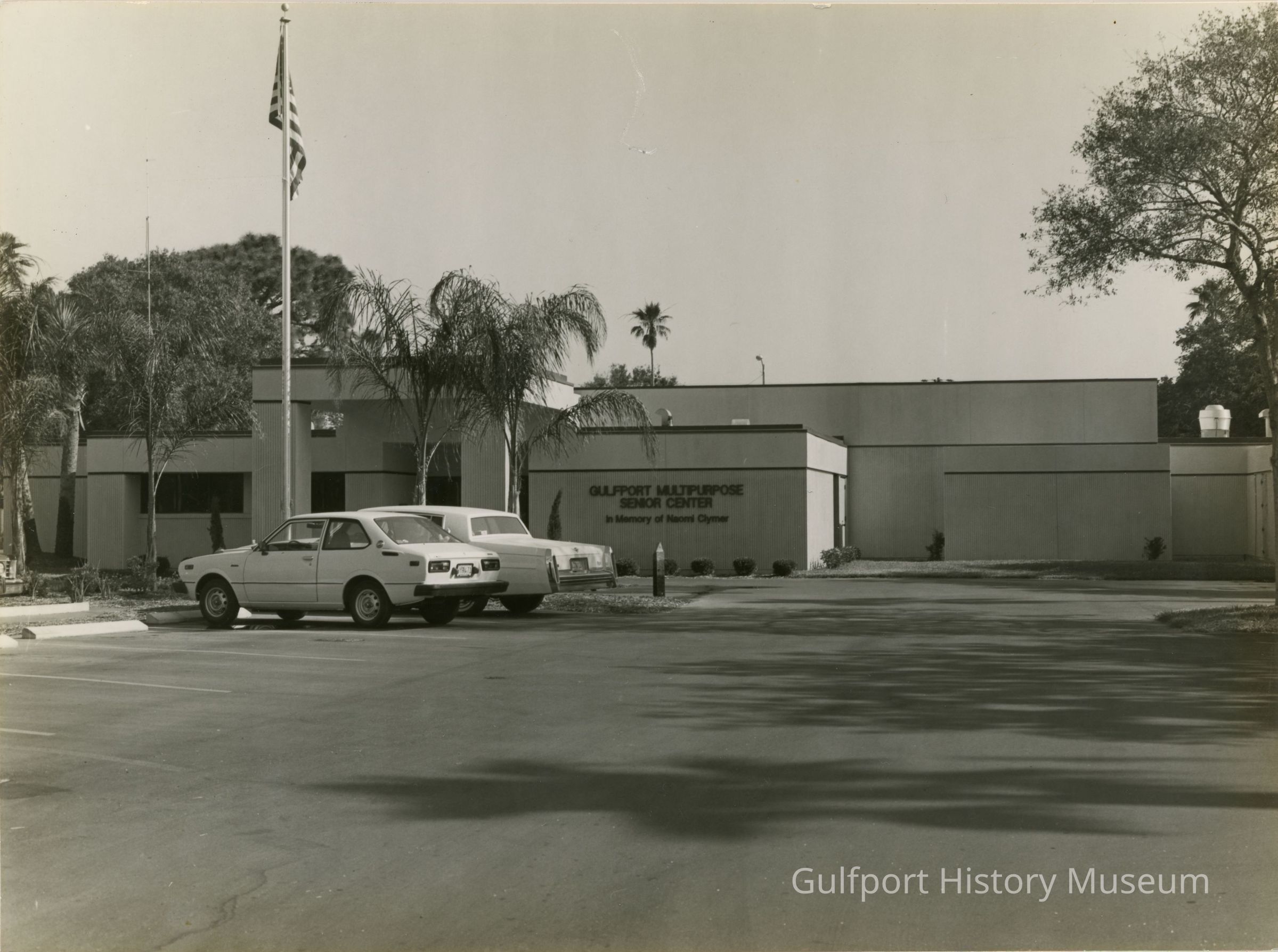A black and white photograph of the Gulfport Multipurpose Senior Center. The building reads: "GULFPORT MULTIPURPOSE SENIOR CENTER / In Memory of Naomi Clymer." Two cars are parked in the lot in front of the building.