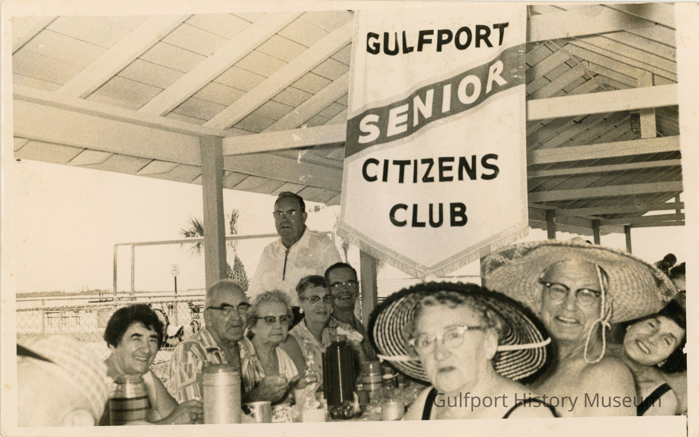 A black and white photograph of a Gulfport Senior Citizens Club picnic at Gulfport Beach. The club members sit at tables underneath a long picnic shelter. 9 people's faces are visible. A large banner that reads, "GULFPORT SENIOR CITIZENS CLUB" hangs above the table from a beam.