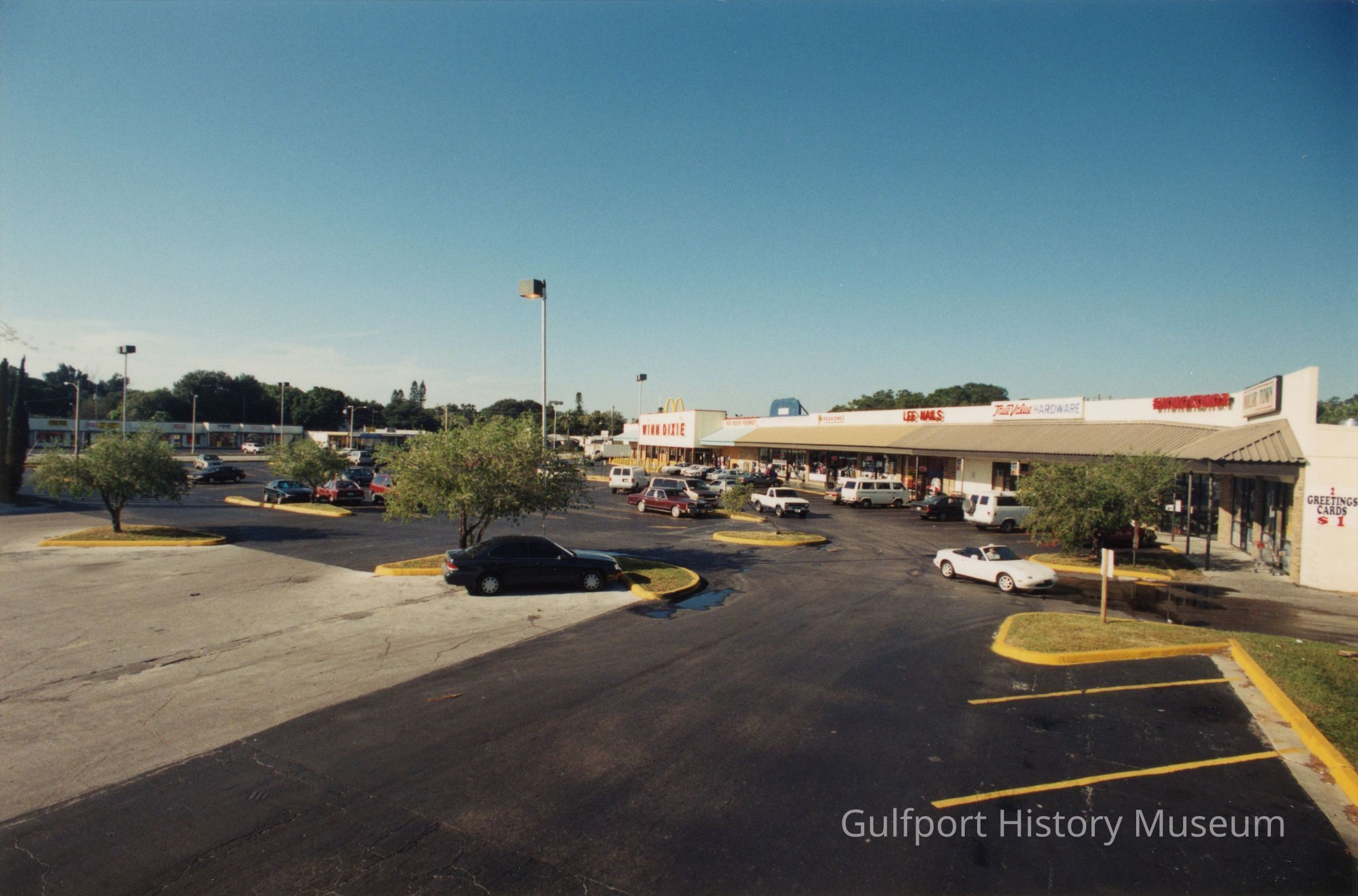 A color photograph of the Gulfport Shopping Center from above its parking lot. The shopping center contains Winn-Dixie, Lee Nails, Hong Kong, True Value Hardware, and [?], a greeting card store.