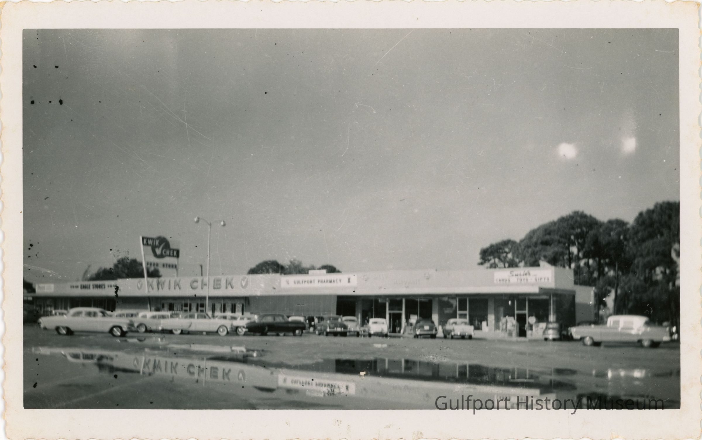 A black and white photograph of the Gulfport Shopping Center from its parking lot. The shopping center contains Eagle Stores, Kwik Check, the Gulfport Pharmacy, and Susie's. There are reflective puddles of water in the lot.