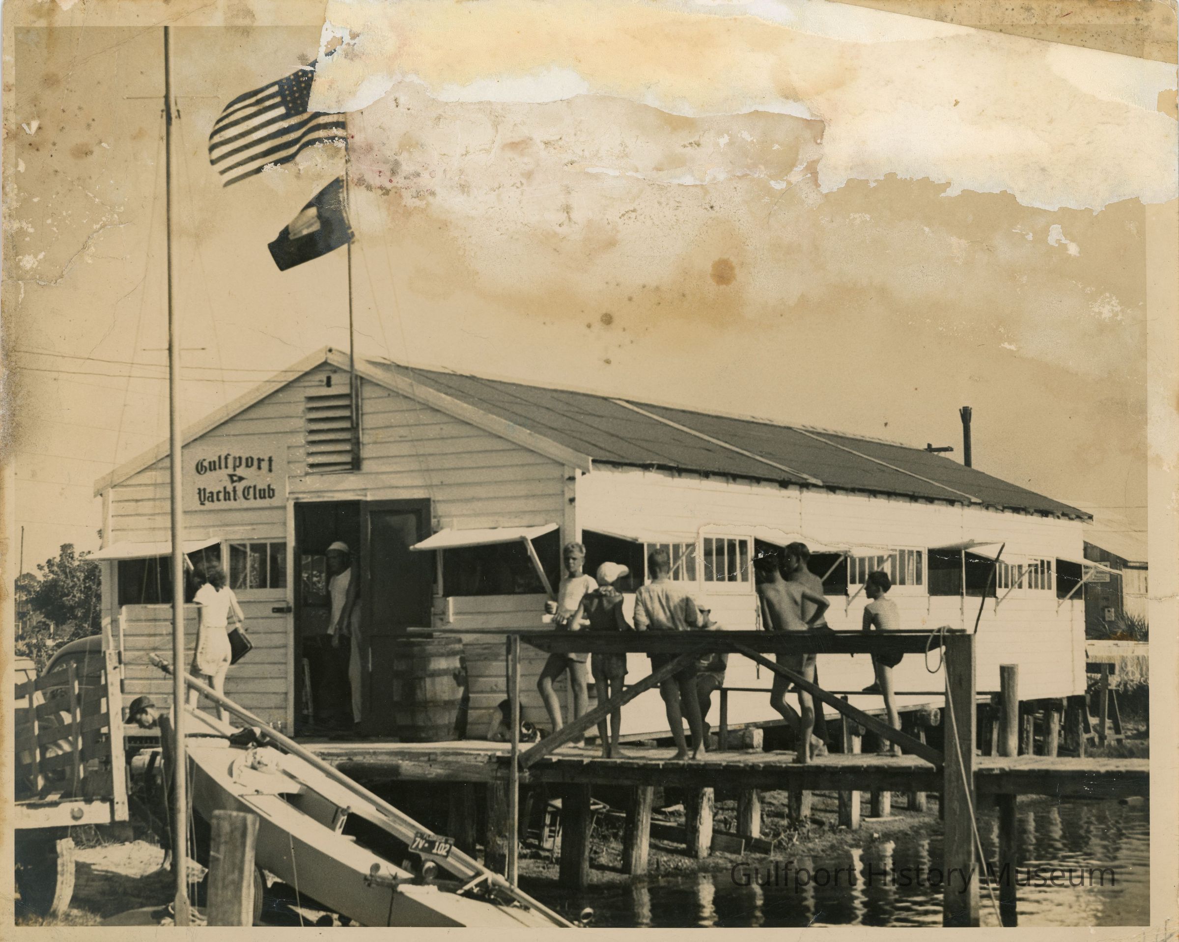 A black and white photograph of the Gulfport Yacht Club clubhouse. A group of children in swimwear or shorts are standing along the bridge walkway to the building. A man is standing in the entranceway and a woman is walking past. The building is on stilts near the water. An American flag and a smaller flag wave above the building. A sign that reads, "Gulfport Yacht Club" is posted by the main entrance.