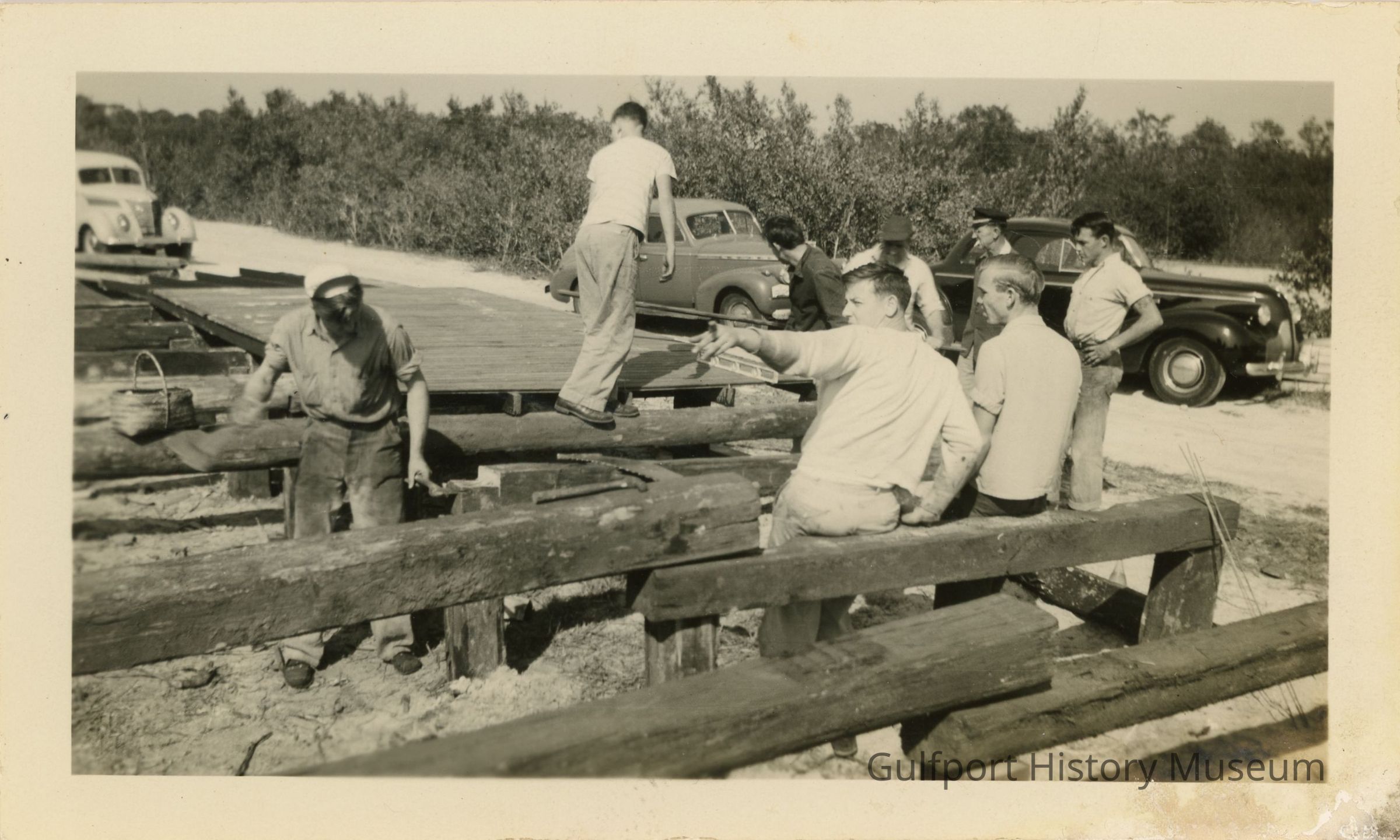 A black and white photograph of the construction of the Gulfport Yacht Club clubhouse. Several men are engaged in foundational work with wooden beams, [including Nathan White]. Three cars are parked in the background.