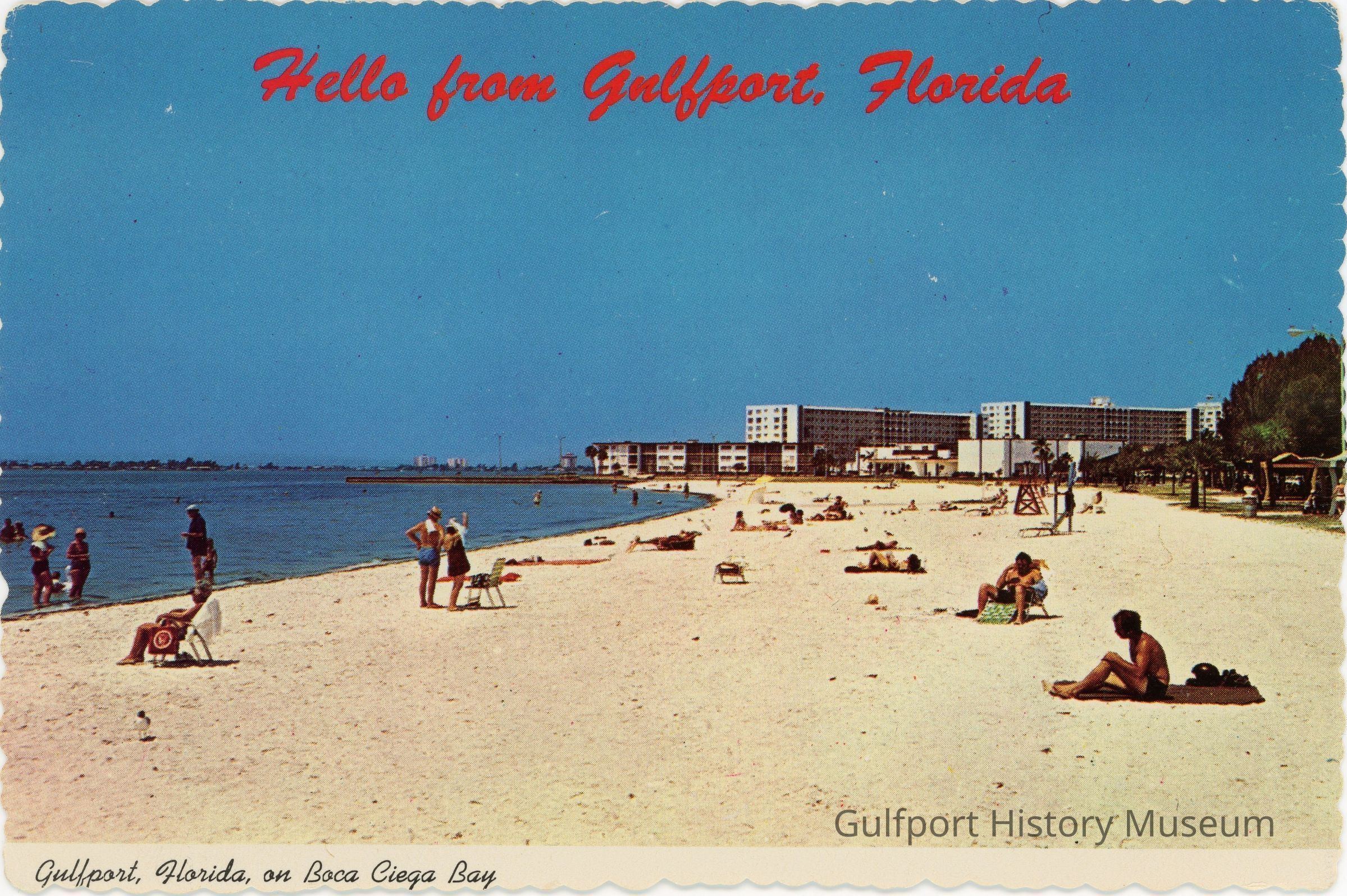 A color photochrome postcard of Gulfport Beach. People sunbathe on the sand and are in the water. Town Shores is visible in the distance. "Hello from Gulfport, Florida"