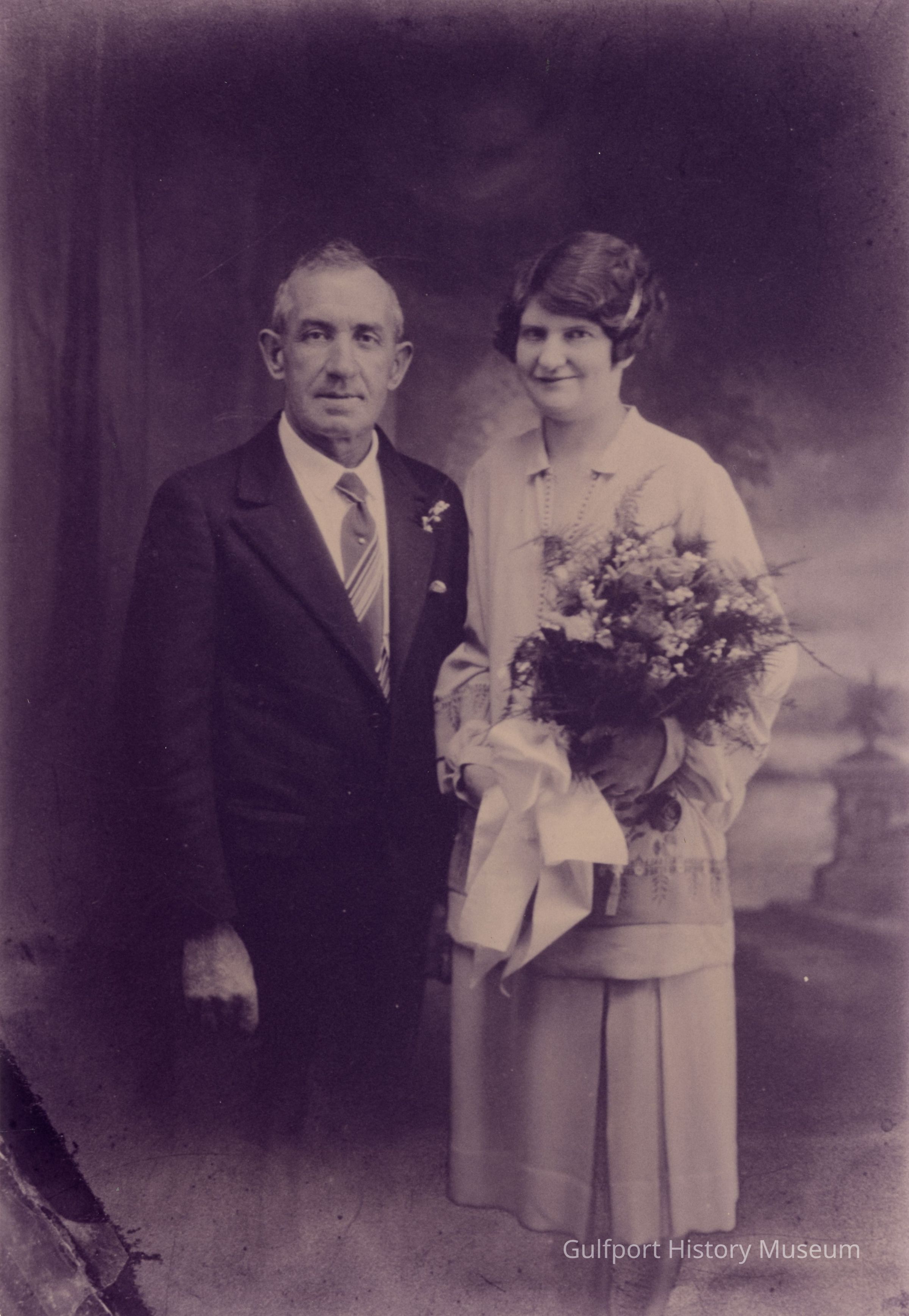 A black and white photographic print of Henry (Harry) Webb (left) and his second wife Florence Bamforth (right). Both are dressed formally; Henry wears a dark suit and striped tie with a lapel flower and Florence is in a lightly colored dress and holds a bouquet of flowers.