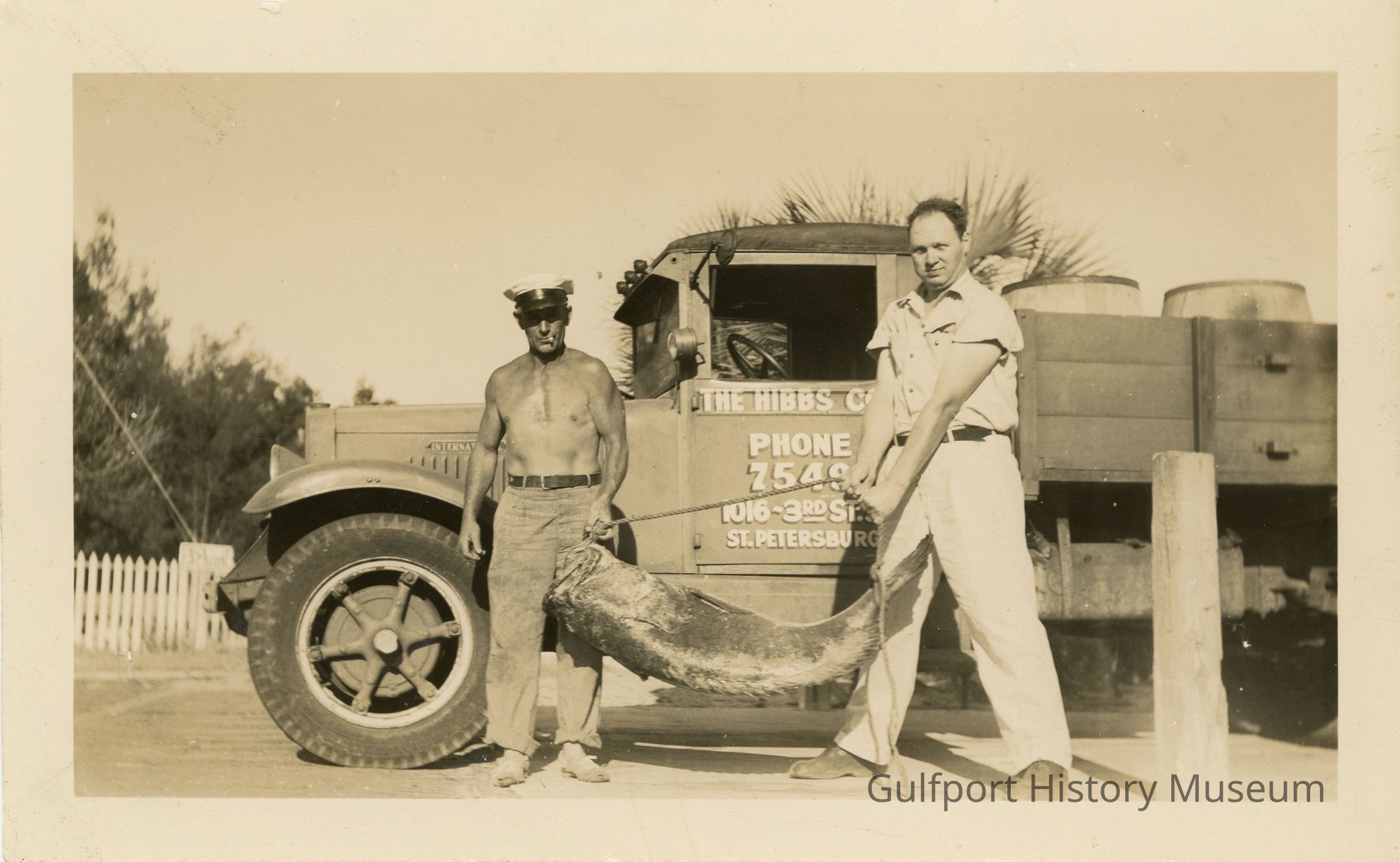 A black and white photograph of two men, one shirtless, holding a large fish from a rope. They are standing in front of a truck with writing in paint on the door reading "THE HIBBS CO. PHONE 7548 1016-3RD ST S ST. PETERSBURG." Barrels are visible in the back of the truck.