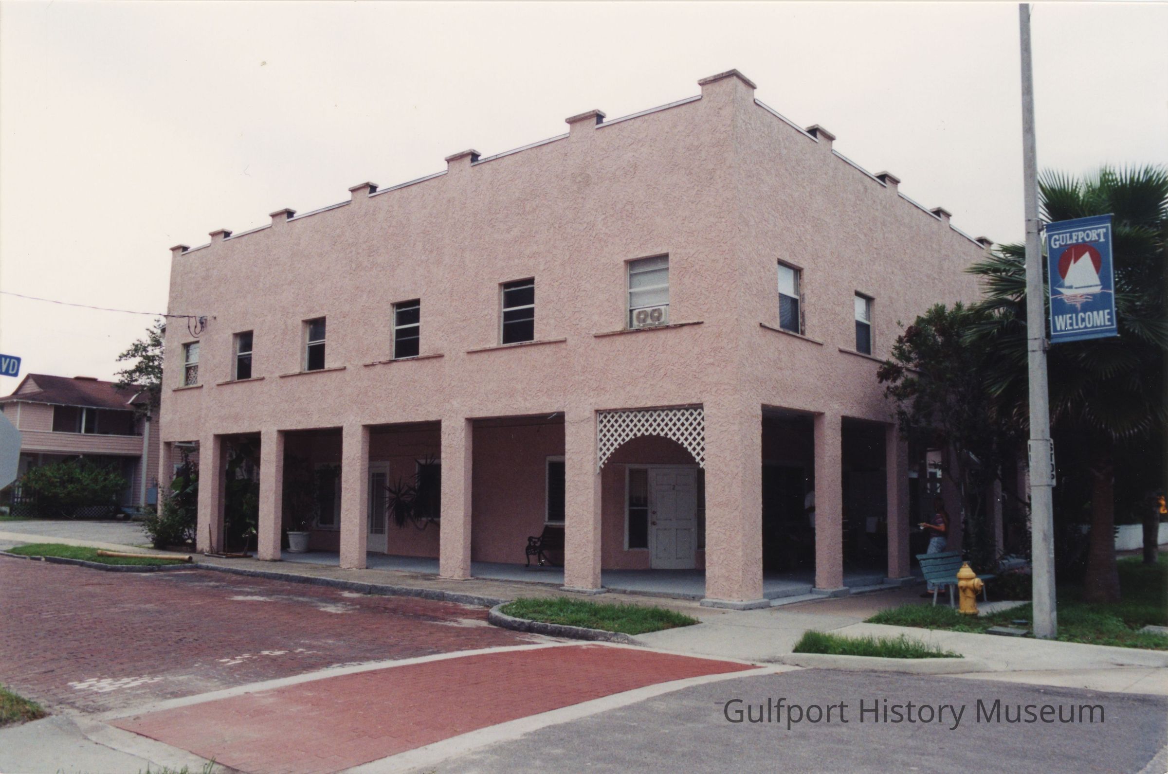 A color photograph of the Holiday Inn building, a two story stucco-style inn on Beach Blvd S. Once an apartment building with Mediterranean style features, rounded arches and other details have been removed or covered through renovation. The pole next to the building has a banner on it with a white sailboat and red sun which reads, "GULFPORT WELCOME."