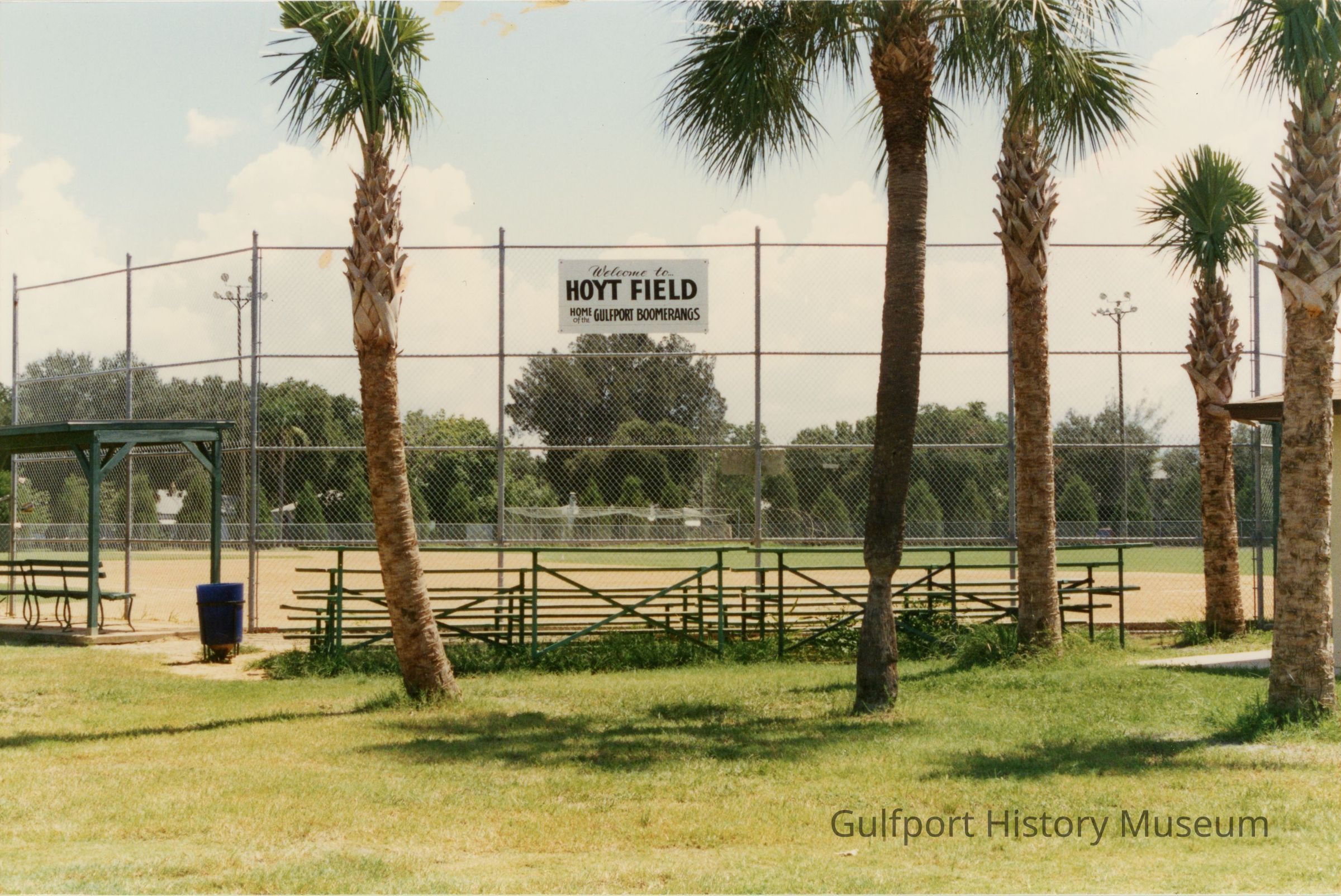 A color photograph of Hoyt Field from behind its surrounding chain link fence. A sign which reads, "Welcome to HOYT FIELD Home of the GULFPORT BOOMERANGS" hangs on it. There is a set of low, green bleachers in between other covered seating. Five palm trees are visible in frame in the foreground.