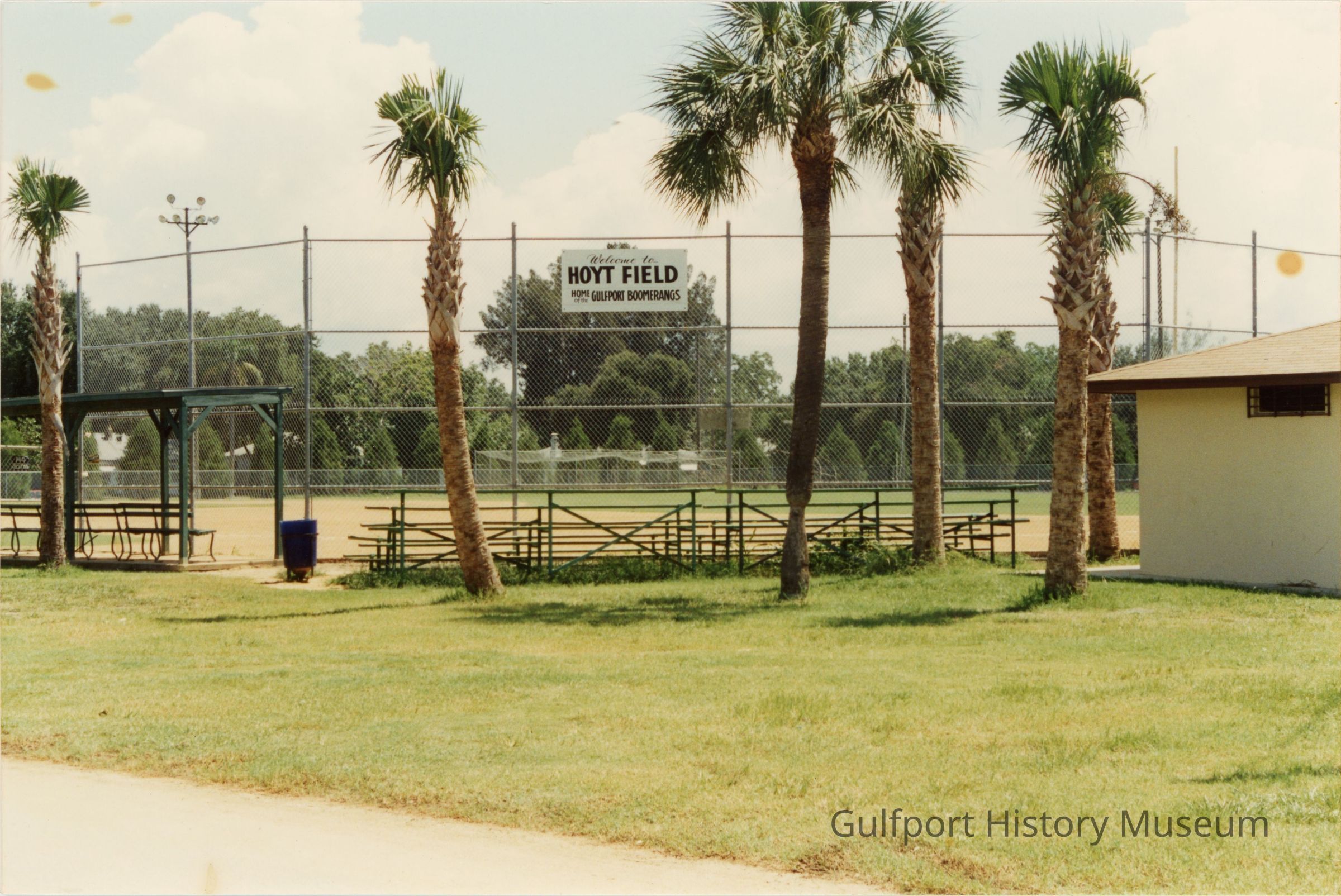 A color photograph of Hoyt Field from behind its surrounding chain link fence. A sign which reads, "Welcome to HOYT FIELD Home of the GULFPORT BOOMERANGS" hangs on it. There is a set of low, green bleachers and a row of other covered seating to the left. Six palm trees are in frame in the foreground. The edge of a building is visible to the right.