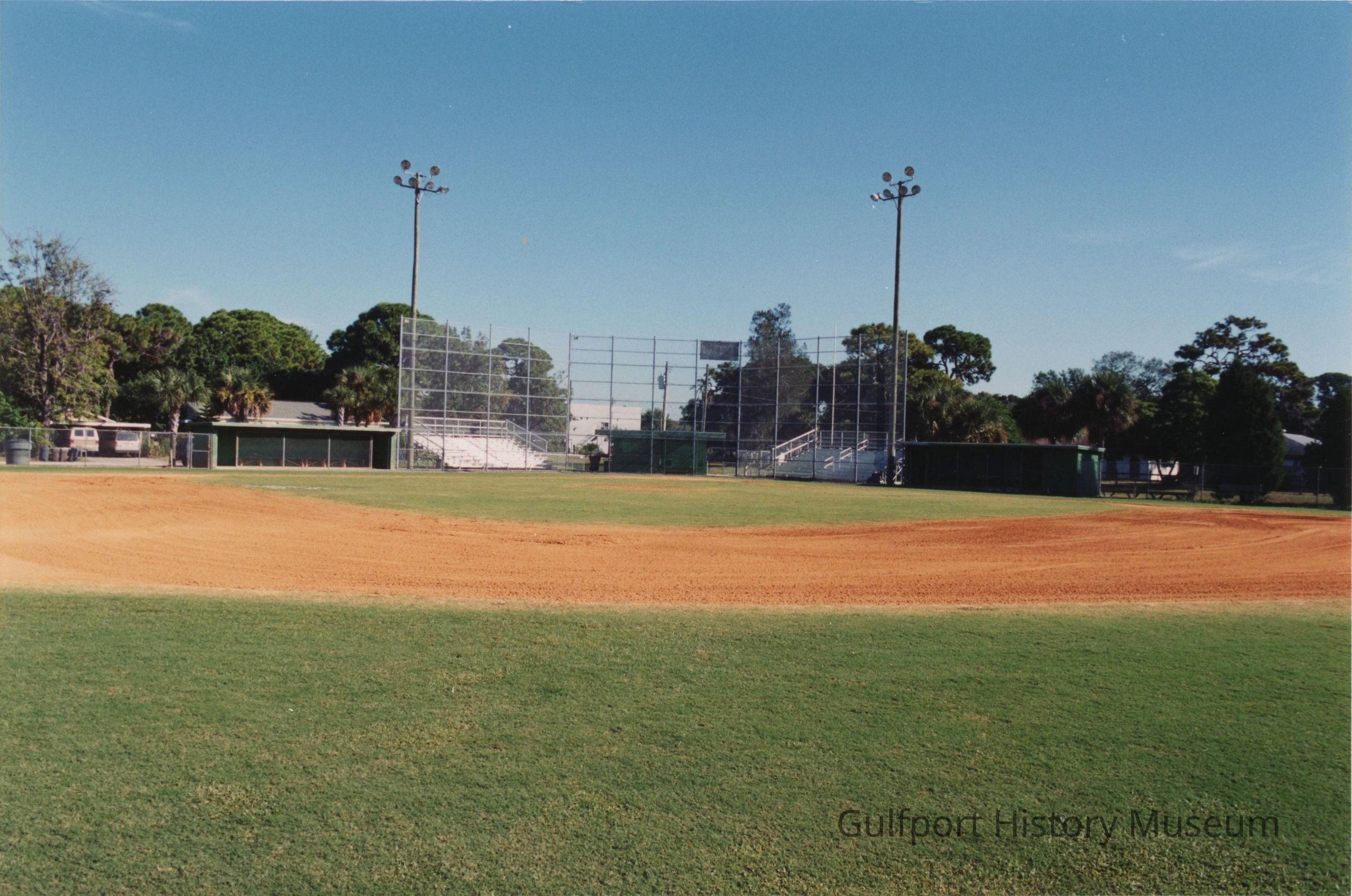 A color photograph of Hoyt Field from the outfield facing home plate. A small building is behind the tall chain link fence behind home plate. Open bleachers, dugouts, and large light posts are on either side. Almost the entirety of the diamond is visible in frame.