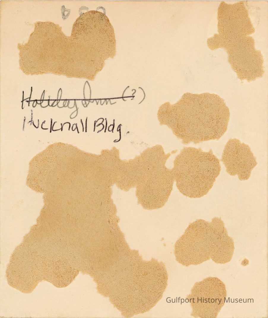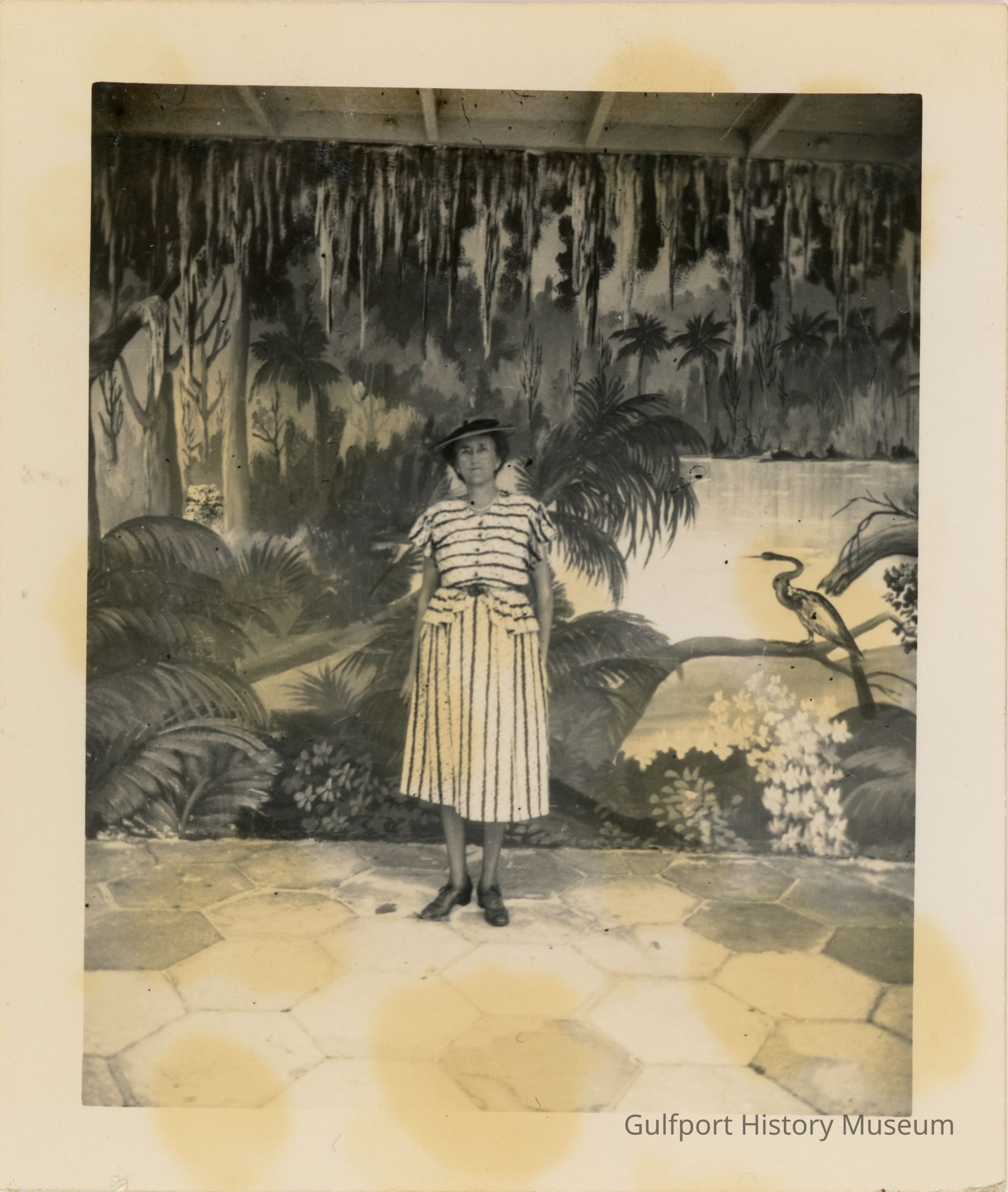 A black and white photograph of a woman wearing a hat and striped skirt and blouse standing in front of a Florida landscape wall mural. The mural was on the side of the Hucknall Building located at the northeast corner of Beach Blvd S and 29th St S, which at the time housed Murphy's Drug Store. Painted by Richard Gray.