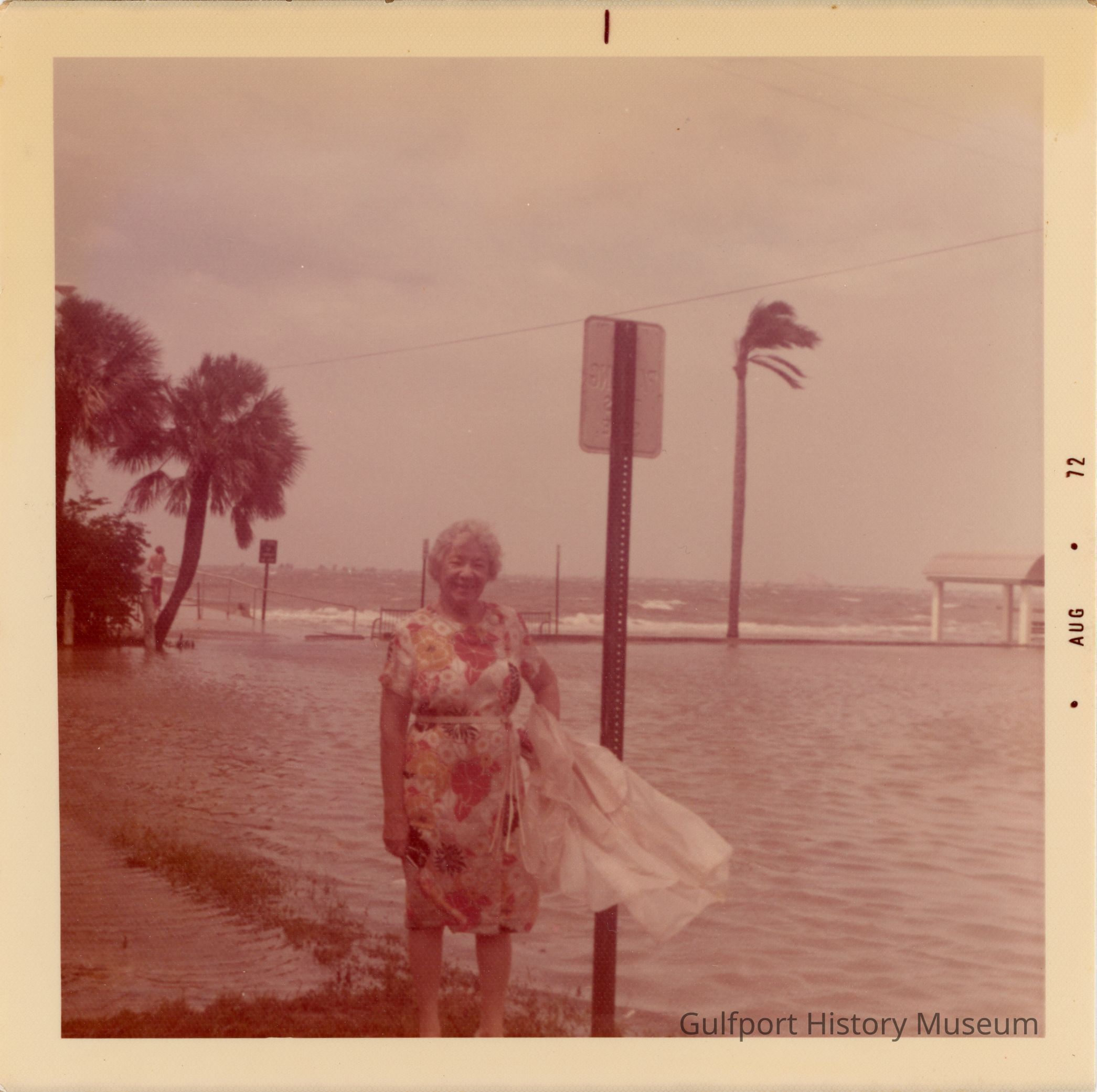 A color photograph of Shore Blvd and 54th St S flooding during Hurricane Agnes. A woman is standing on a patch of unflooded grass by a road sign. She is wearing a colorful floral dress and holding what appears to be a clear raincoat. The winds are blowing visible palm trees. The entrance to the Municipal Pier and Boca Ciega Bay can be seen in the background.