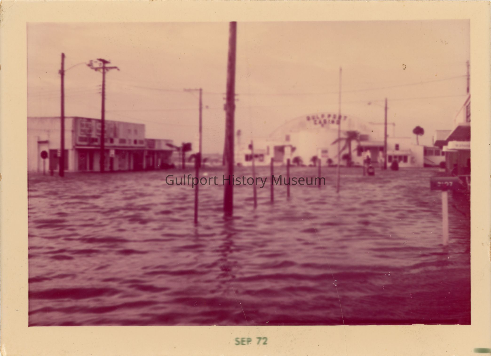 A color photograph of Beach Blvd flooded during Hurricane Agnes. The water has completely covered the street and sidewalks. The photograph looks south toward the Gulfport Casino and Boca Ciega Bay.