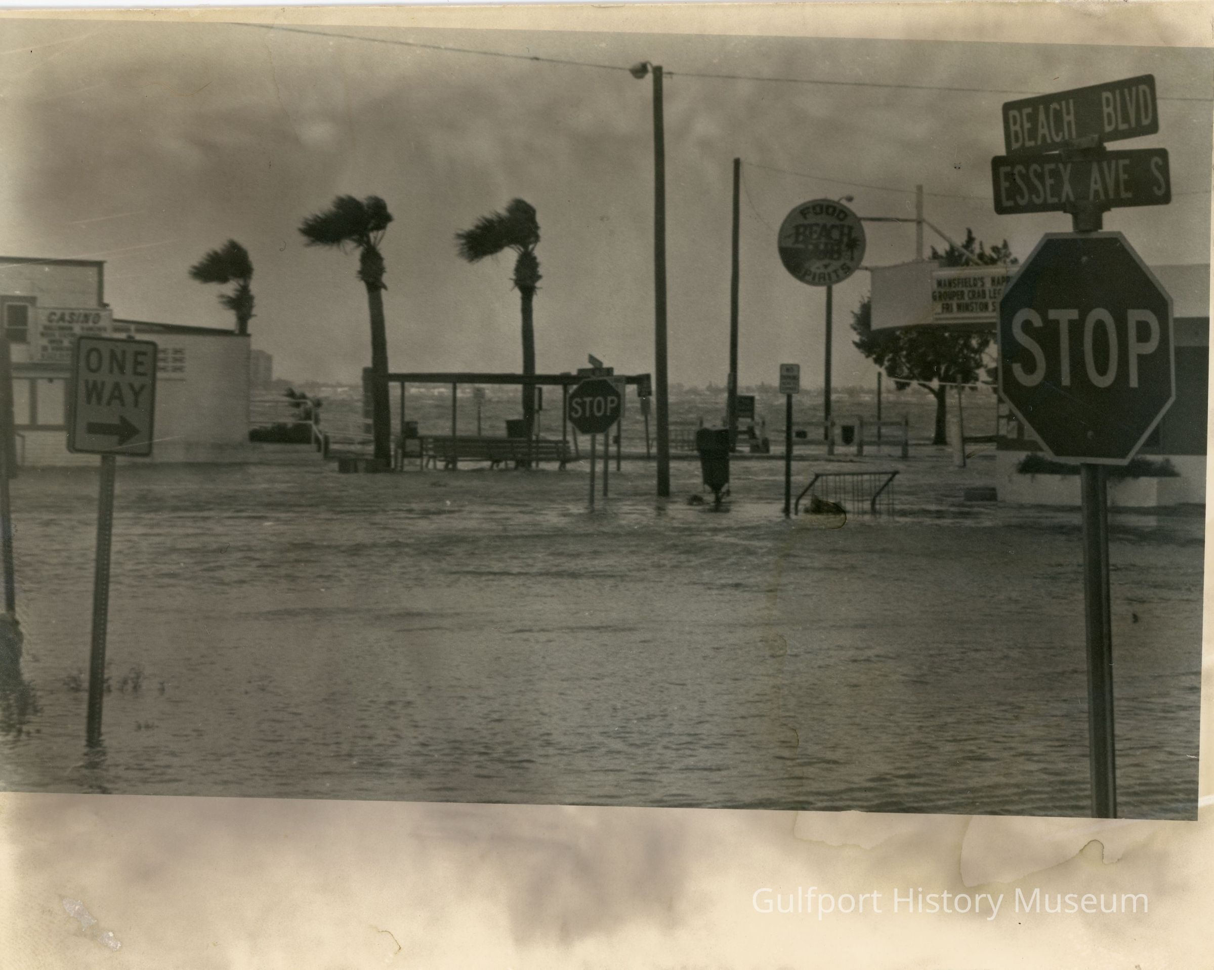 A black and white photograph of flooding during a storm, potentially 1985's Hurricane Elena, at the intersection Beach Blvd and Essex Blvd looking south toward Boca Ciega Bay. The street sign and stop sign stand in the foreground. The Beach Pub and Gulfport Casino are visible either side of frame on Shore Blvd.