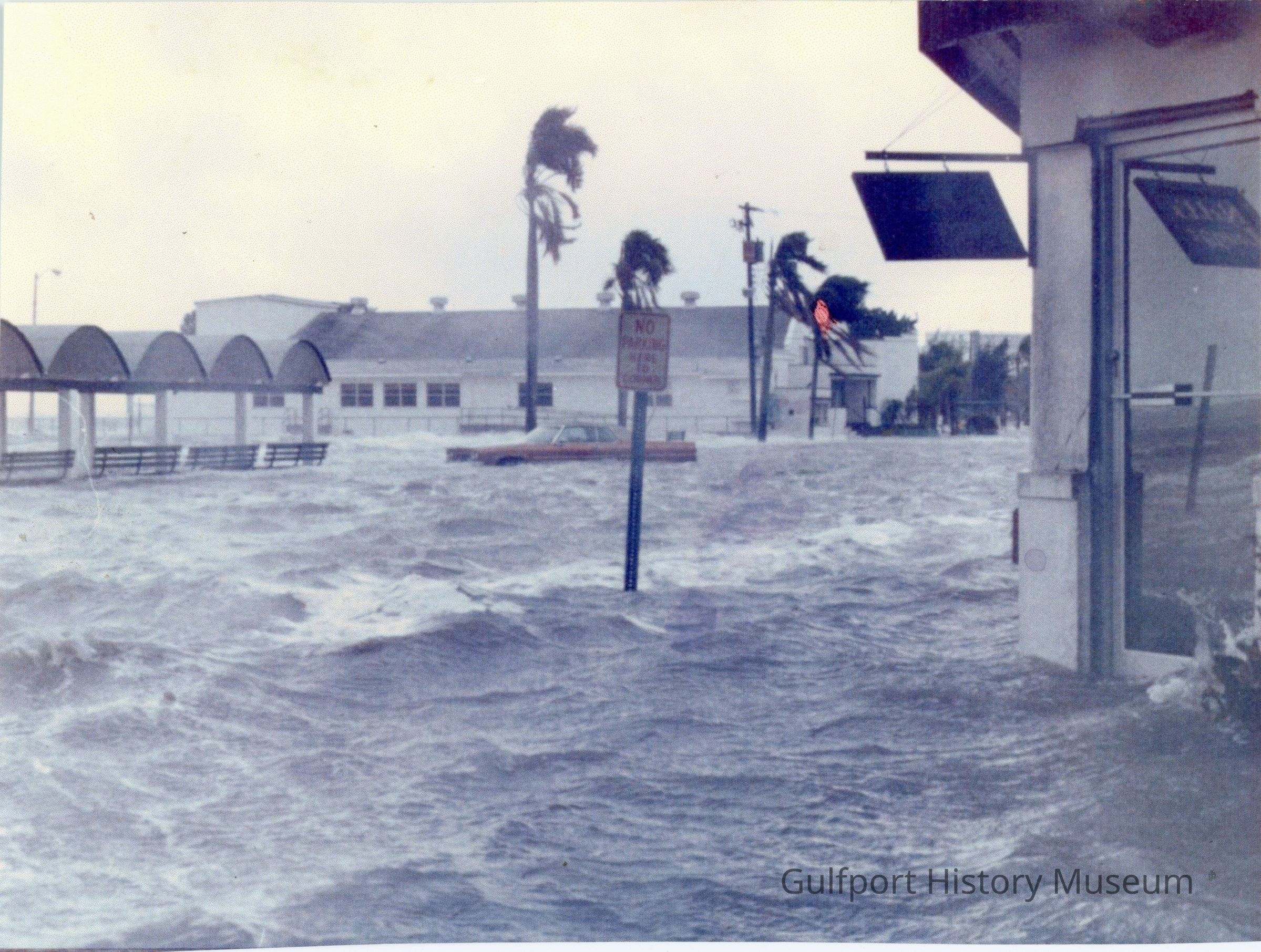 A color photograph of Shore Blvd at 54th St S flooded by a storm. The water level is approximately 1-2 ft deep. The wind is blowing and the waters are churning, completely covering the streets. There is a car parked on the street which is halfway submerged by the water. There are four benches under a long shelter, also half submerged. The Gulfport Casino can be seen in the background.