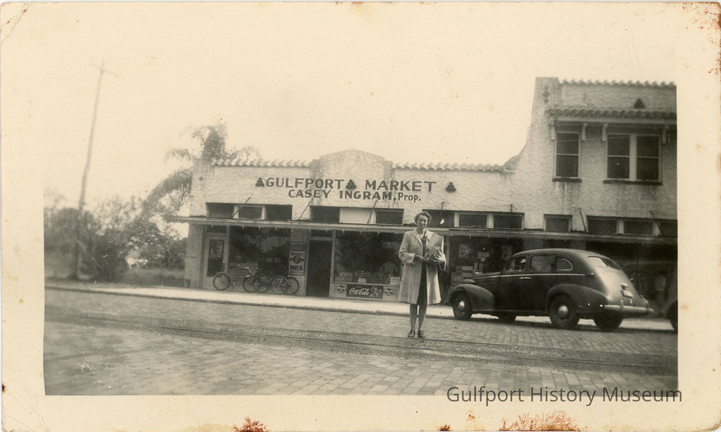 A black and white photograph of the Gulfport Market with a sign that says "GULFPORT MARKET CASEY INGRAM. Prop." on the front of the building, which has an awning that stretches across. There are advertisements by the windows, including a signs for Coca-Cola and Foremost Milk. Bicycles lean against the building and a car is parked in the road. A woman standing in the middle of the road on the trolley tracks is holding a bag of groceries.