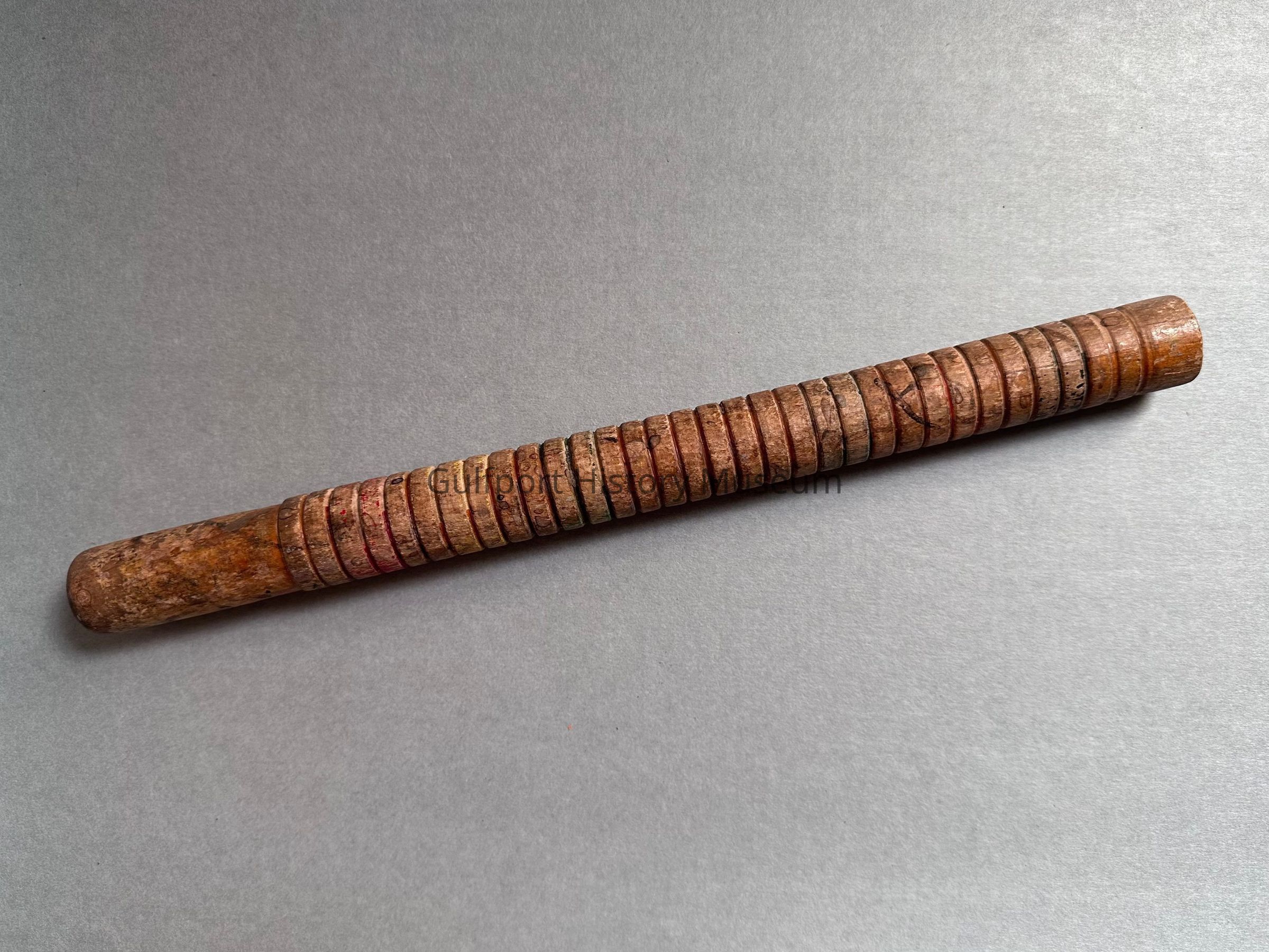 Called a "guiro," a wooden cylinder with ridges with a which a stick is supposed to be dragged across to create a noise.