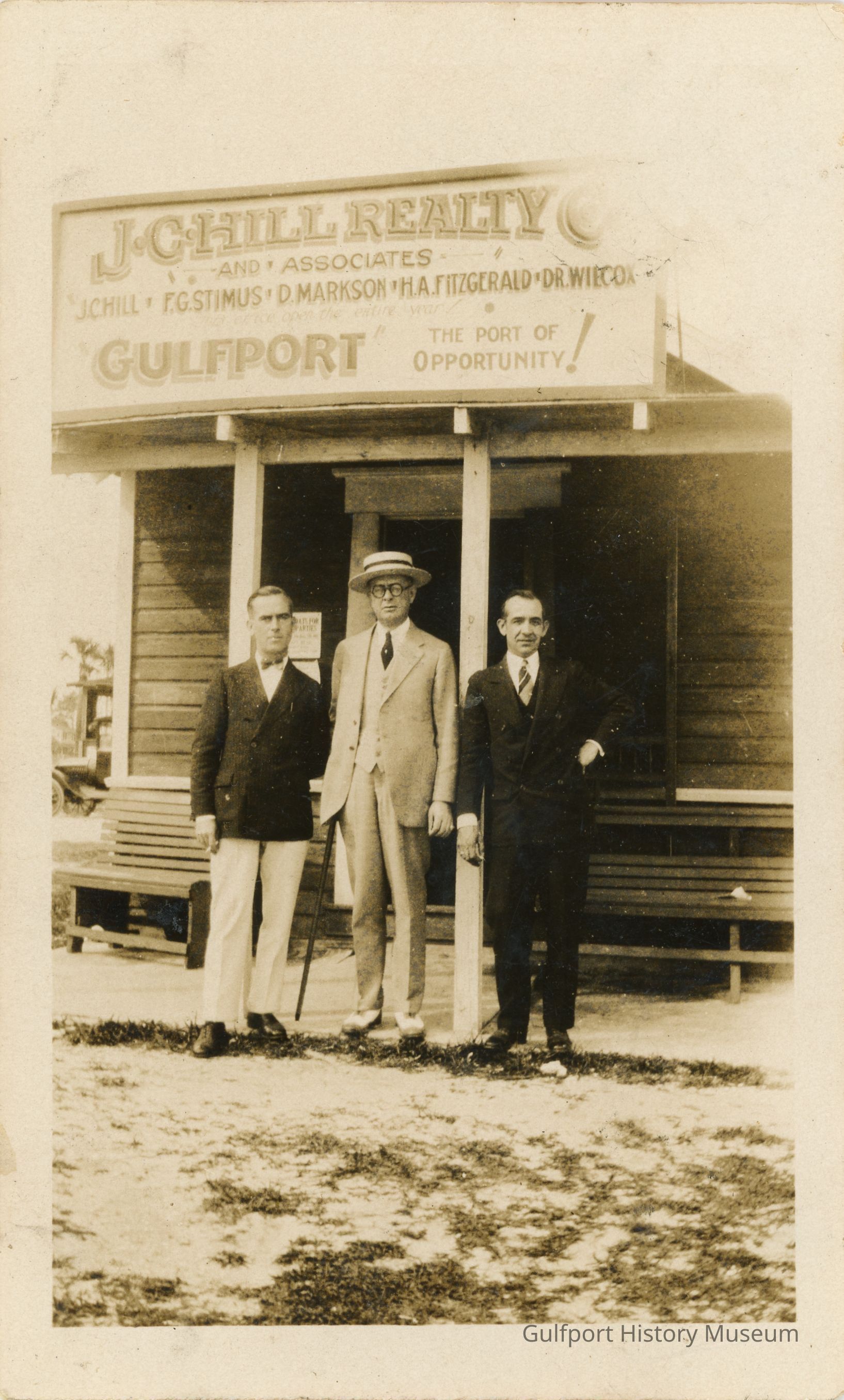 A black and white photograph of three men dressed in suits in front of a real estate office on Shore Blvd. The sign above the building reads, "J.C. HILL REALITY C[O.] AND ASSOCIATES J.CHILL - F.G.STIMUS - D.MARKSON - H.A.FITZGERALD - DR.WILCOX GULFPORT THE PORT OF OPPORTUNITY!" The building has two benches in front of it and a wooden awning. The exterior is made of wood panel slats.