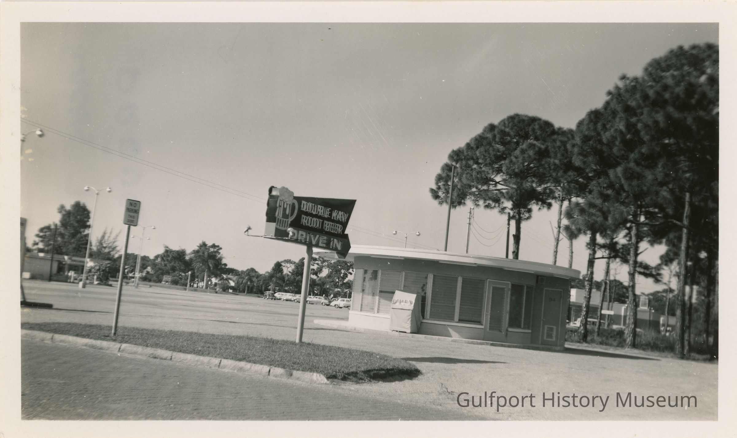 A black and white photograph of Jack's 7 Seas Drive In at 2025 49th St S, a circular, flat-roofed building. A jukebox sits under the overhang. A large sign in front of the building by the road features a large root beer mug and reads "DOUBLE KAY ROOT BEER" and "DRIVE IN." The Gulfport Shopping Center can be partially seen in the background.