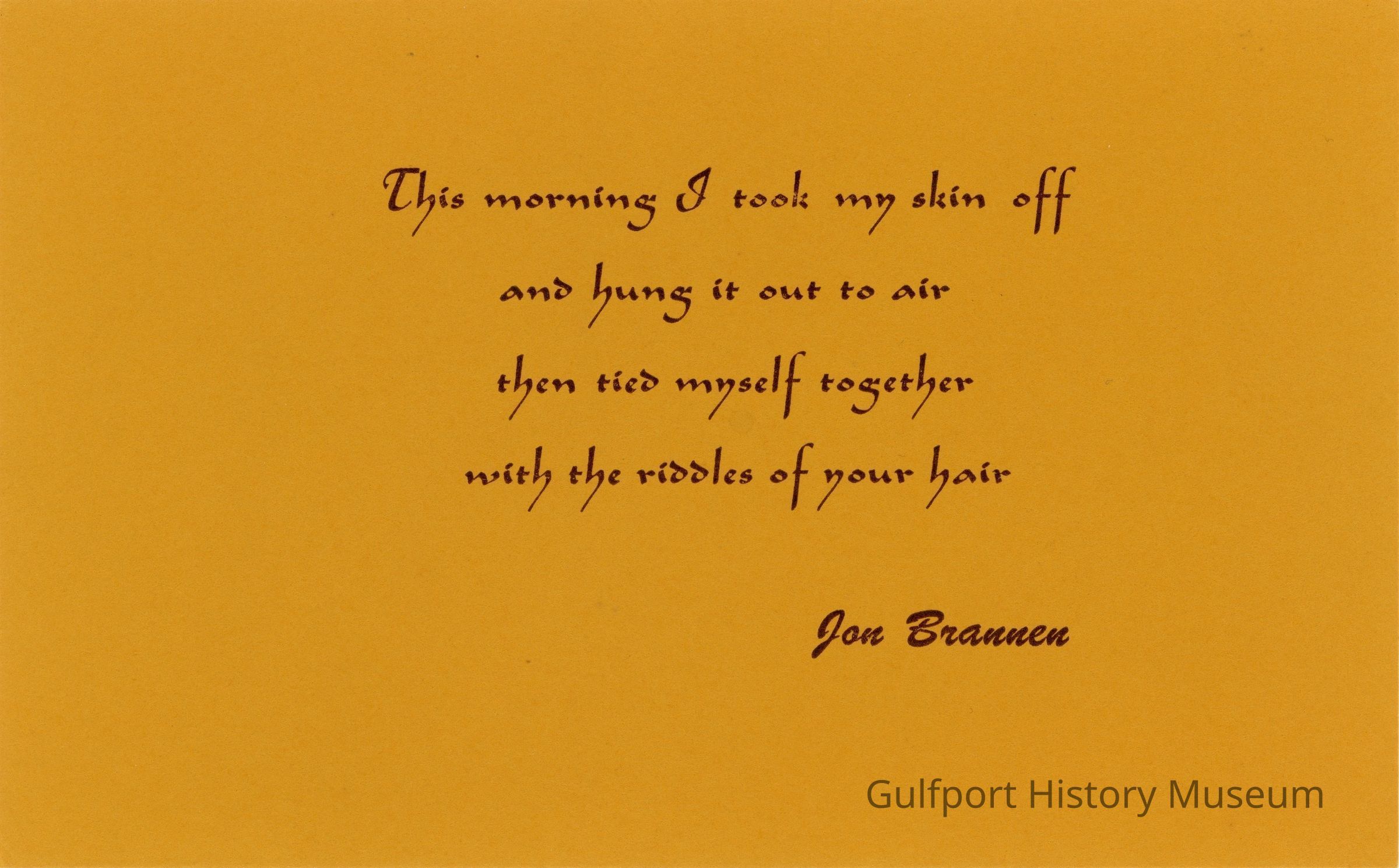 This morning I took my skin off and hung it out to air then tied myself together with the riddles of your hair Jon Brannen