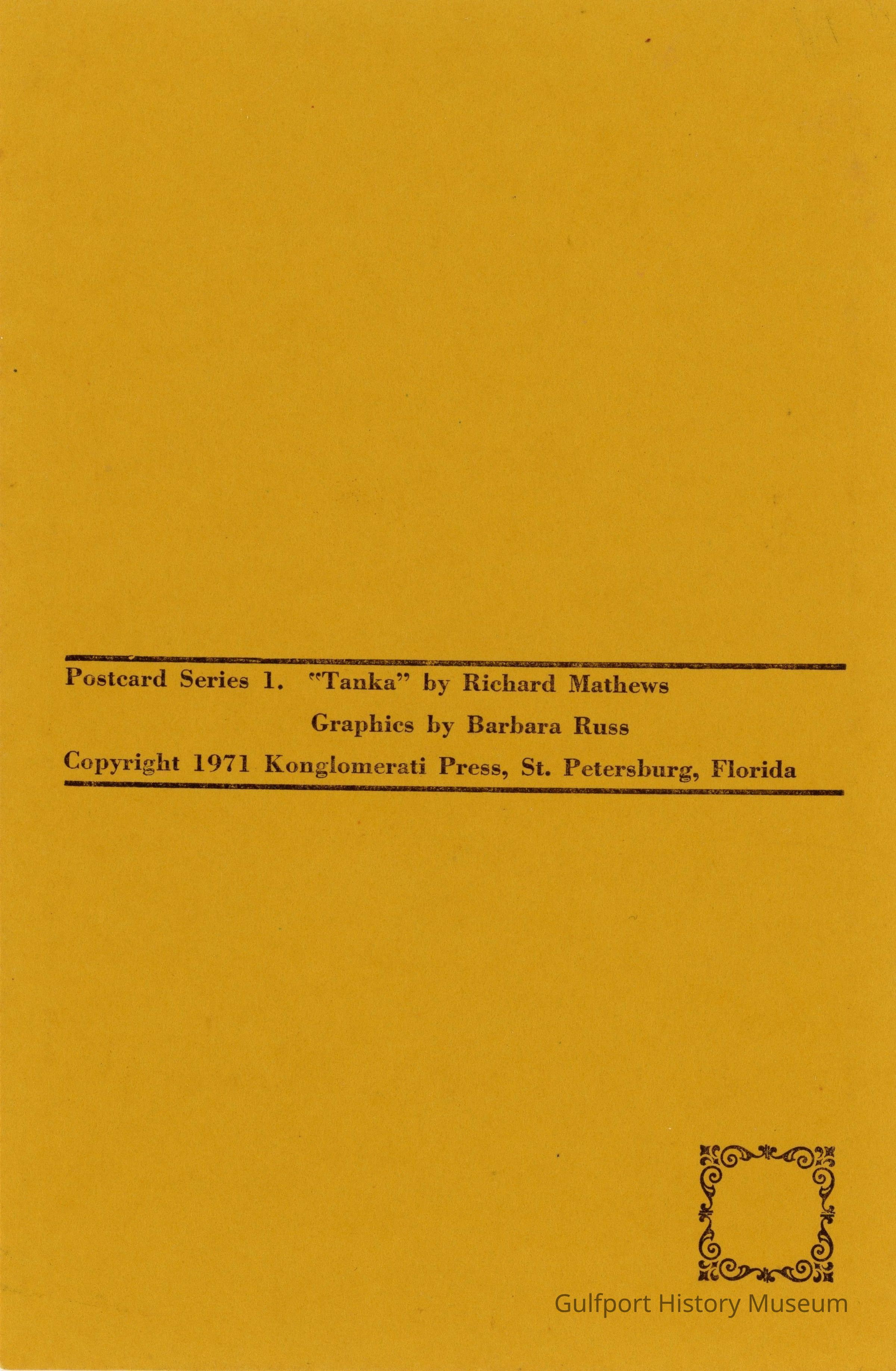 Postcard Series 1. "Tanka" by Richard Mathews Graphics by Barbara Russ Copyright 1971 Konglomerati Press, St. Petersburg, Florida