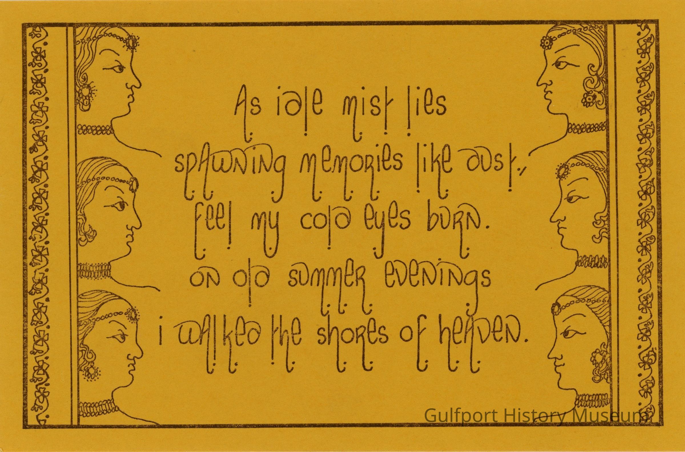 As idle mist lies spawning memories like dust, feel my cold eyes burn. on old summer evenings i walked the shores of heaven.