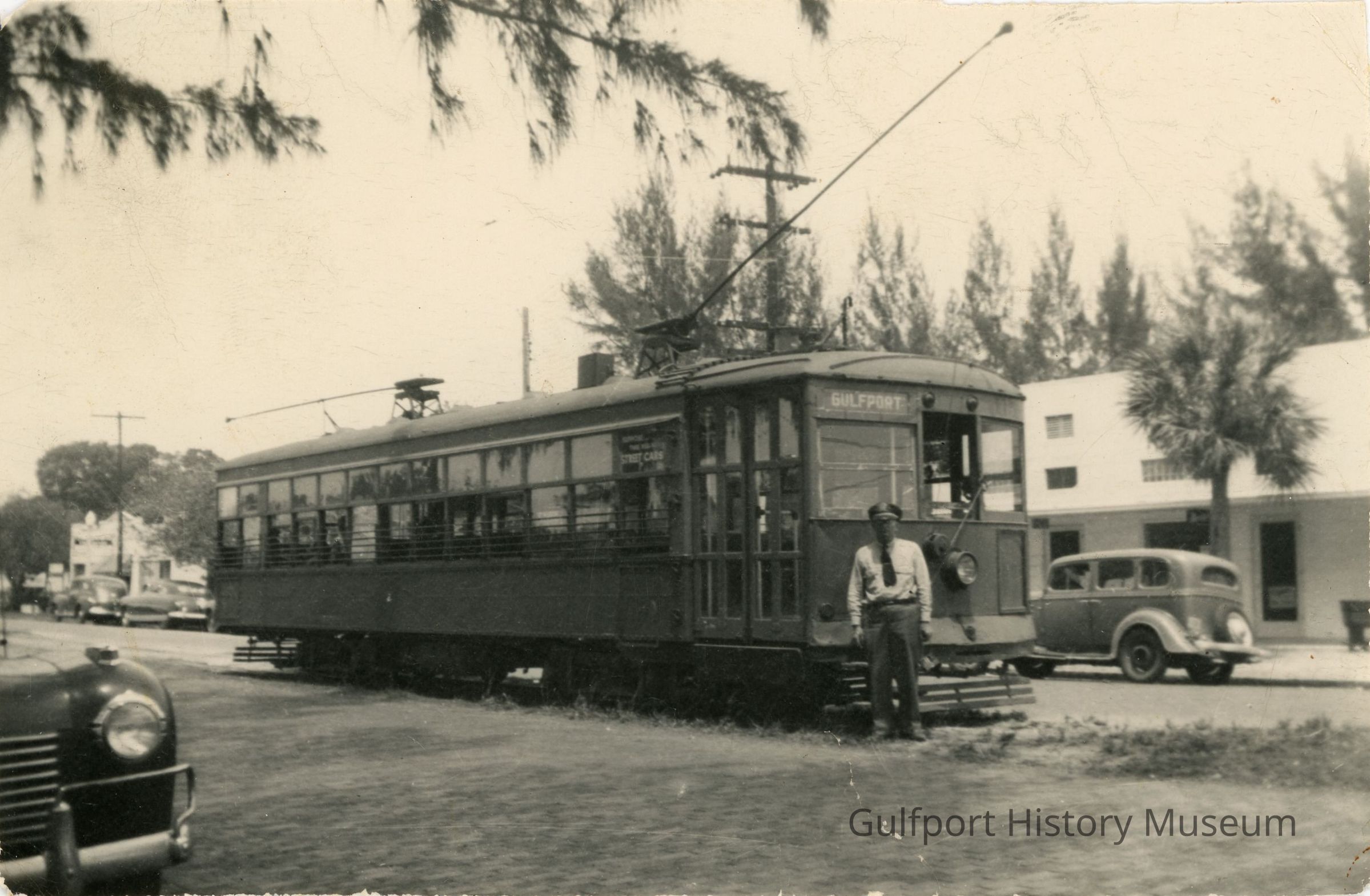 A black and white photograph of a conductor, [Frank Chaney], standing on Beach Blvd in front of the parked last trolley to Gulfport.