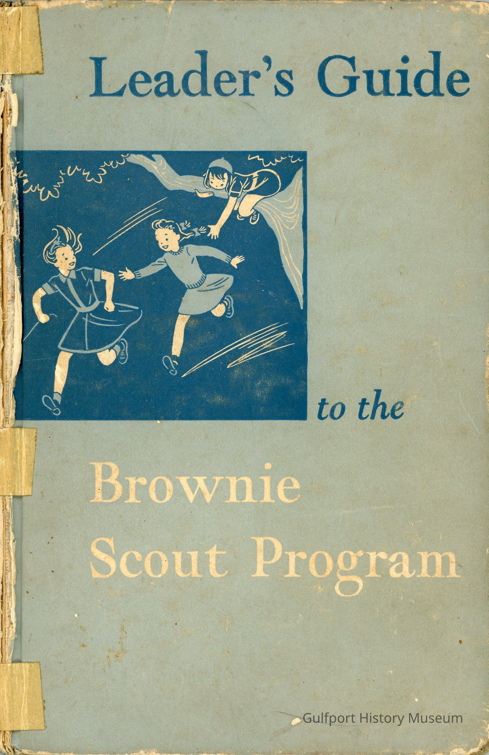 A 1950 Girl Scout handbook. Blue with wraparound illustration featuring three girls, a dog, and a Brownie elf trefoil.