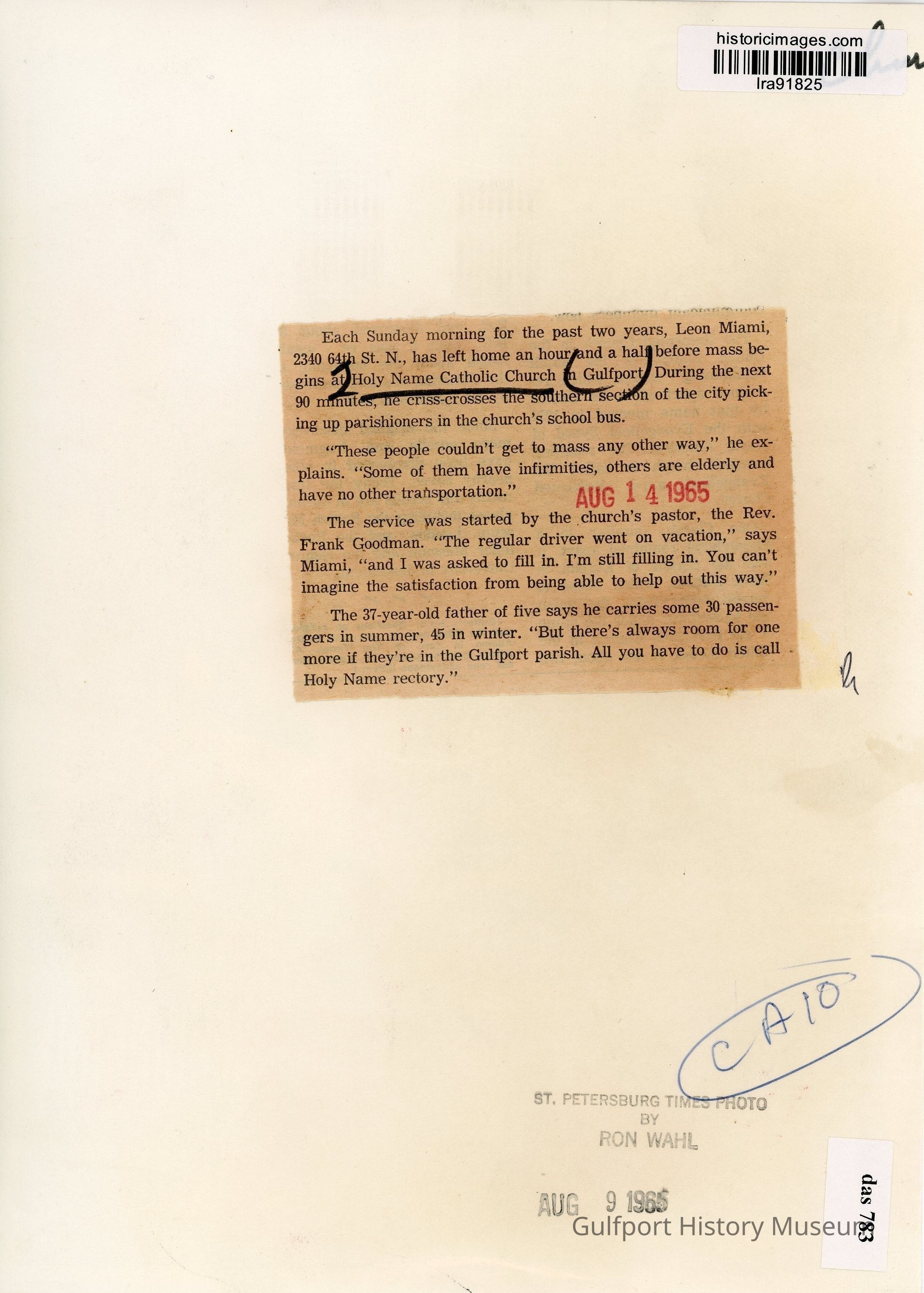 Each Sunday morning for the past two years, Leon Miami, 2340 64th St. N., has left home an hour and a half before mass begins at Holy Name Catholic Church in Gulfport. During the next 90 minutes, he criss-crosses the southern section of the city picking up parishioners in the church's school bus.
