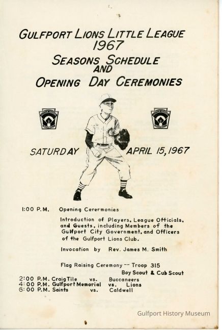 A Gulfport Lions Little League 1967 season schedule and opening day ceremonies program booklet.